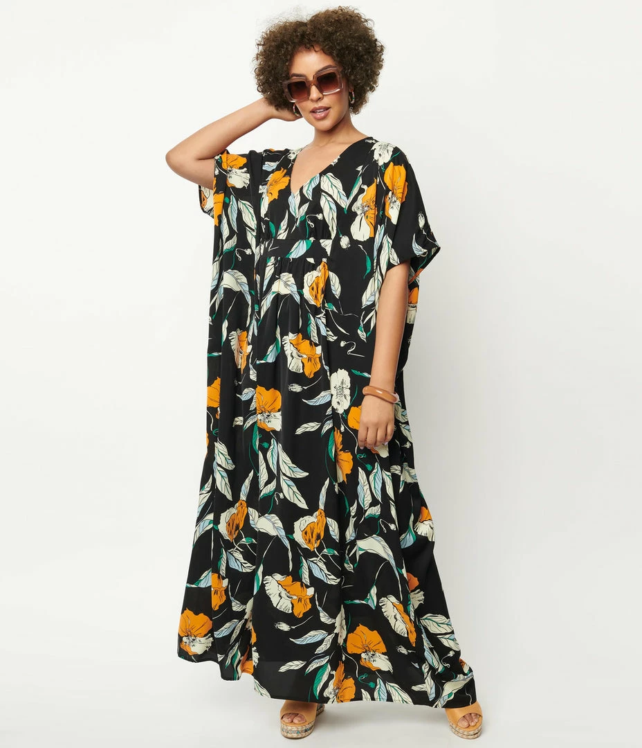 Swimwear Unique Vintage Black & Orange Floral Burton Caftan Dress