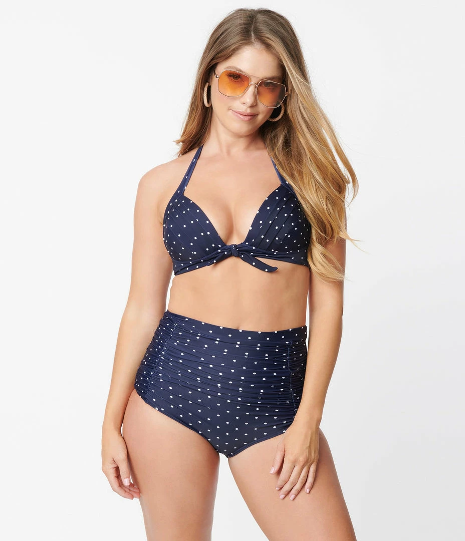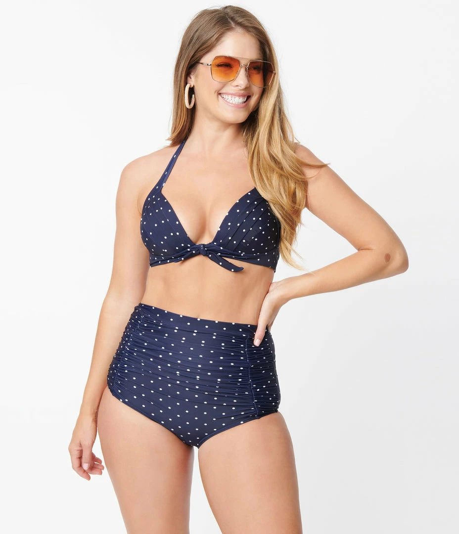 Swimwear Unique Vintage Navy & White Pin Dot Monroe Halter Swim Top