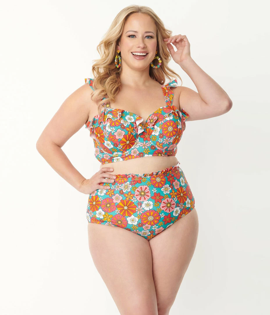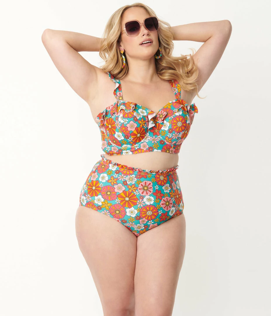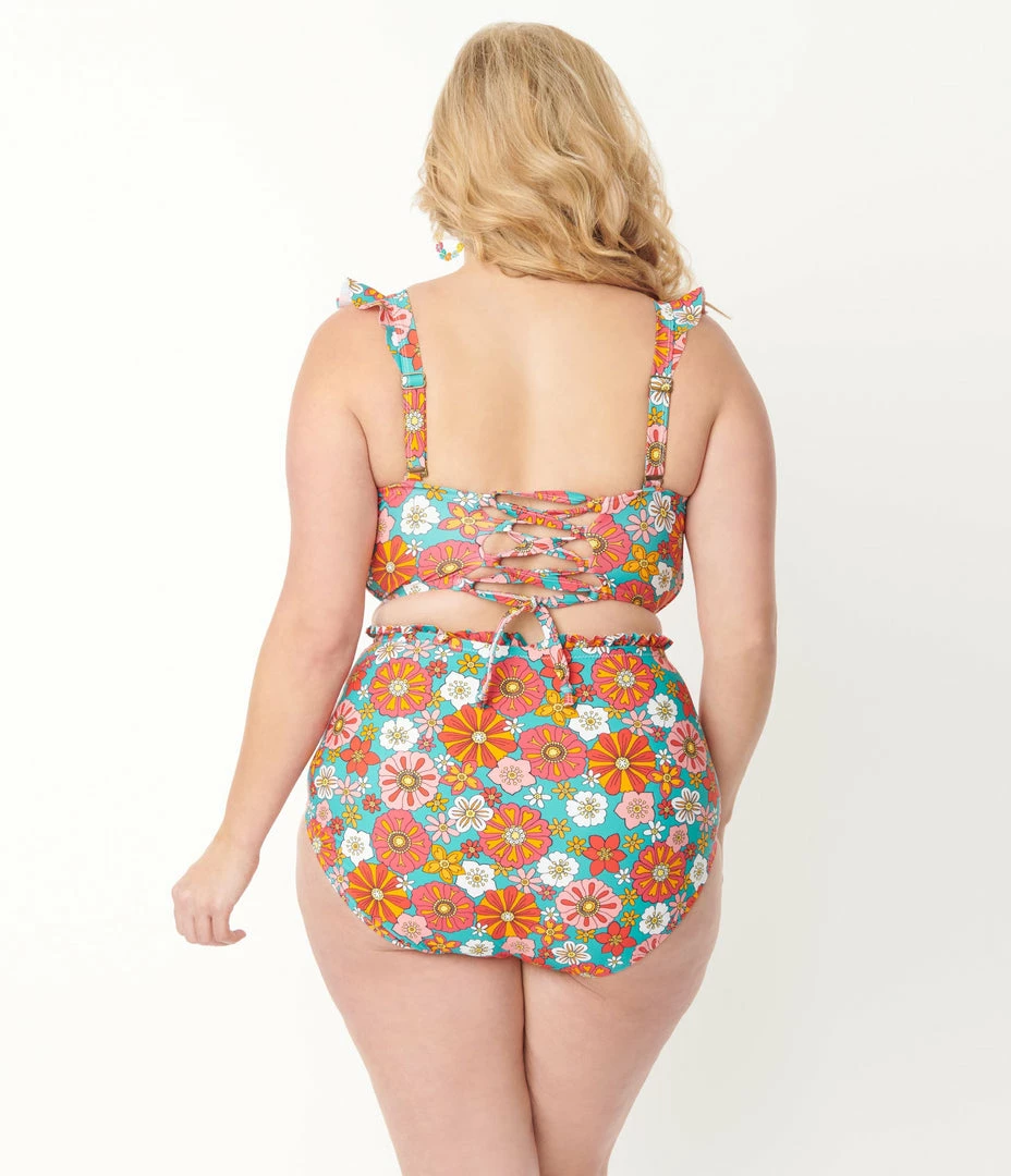 Bring some summer flourish to the pool, darling! This sweet plus size swim top from Unique Vintage boasts a groovy floral print in pink, white, and orange throughout a turquoise background. The structured design provides plenty of support with molded cups, side boning, and underwire while the adjustable spaghetti straps and lace up back provide a flattering fit. Complete with a flirty ruffle along the neckline and straps, it’s your time to thrive!