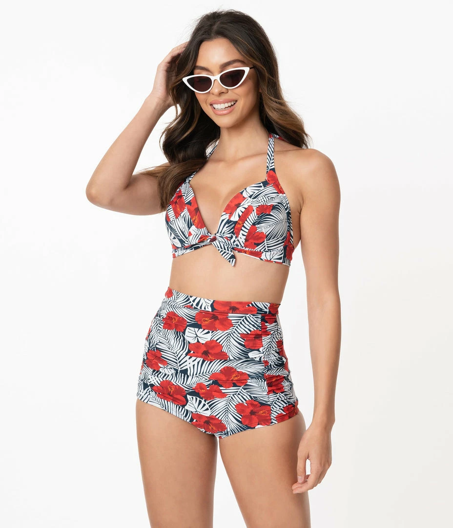 Swimwear Unique Vintage Tropical Print & Red Hibiscus Monroe Halter Swim Top