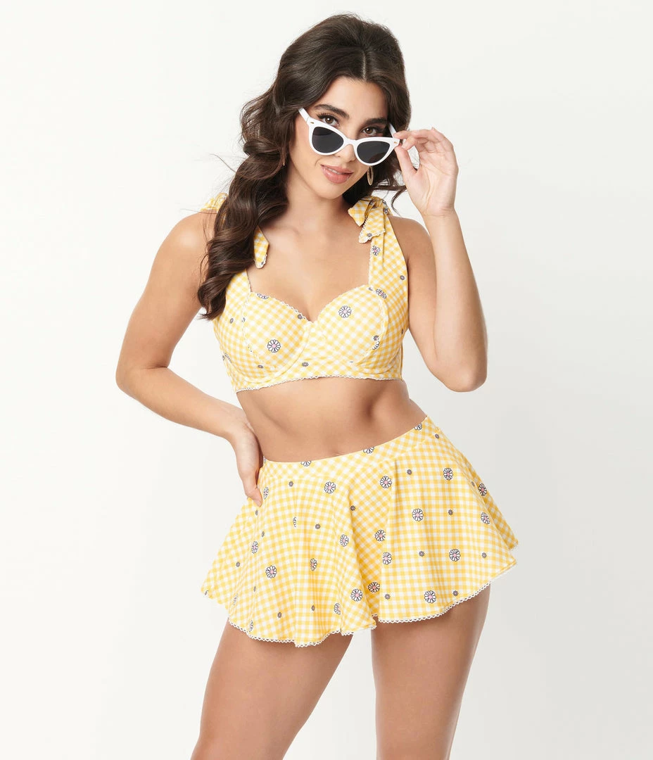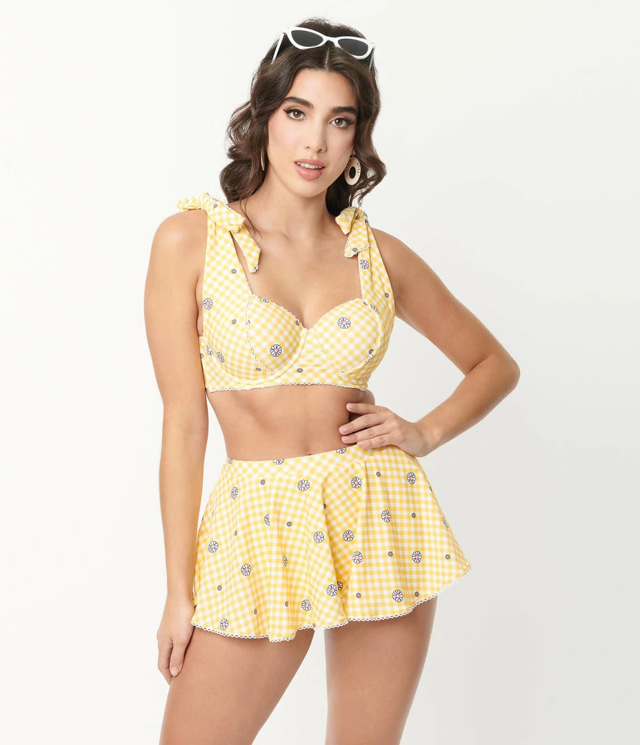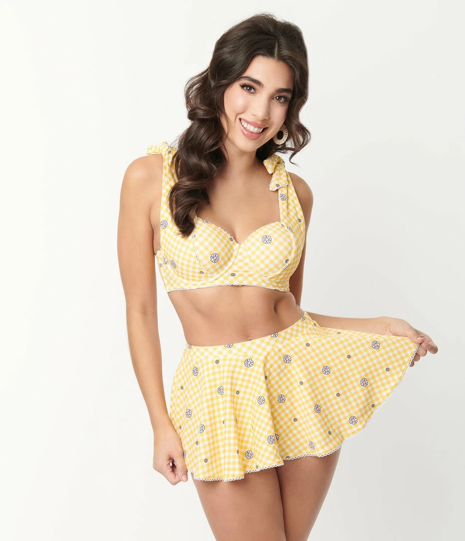 Swimwear Unique Vintage Yellow Gingham & Daisy Pin-Up Coronado Swim Skirt