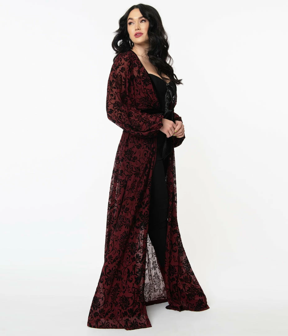 Conquer the silver screen, darling! A heart-stopping addition to your vintage wardrobe, the Hollywood Duster from Unique Vintage is a gorgeous staple for a dramatic dame. Crafted in a beautiful burgundy red and black Devore velvet that dance with a charming deco pattern throughout, the solid black waistband is cinched with attached ties for a flattering fit. The billowing long sleeves drop into an elastic cuff while the open skirt cascades o the floor for sweeping entrances!