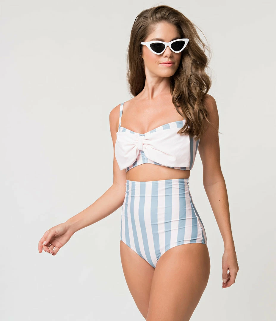 Unique Vintage 1950s Style Pink & Blue Stripe Bow Dee Dee Swim Top