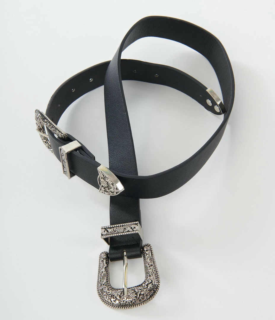 This black leatherette belt boasts two western style buckles crafted in silver hardware for a marvelous adjustable cinch.
