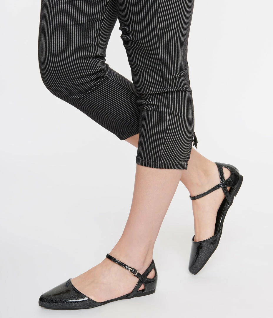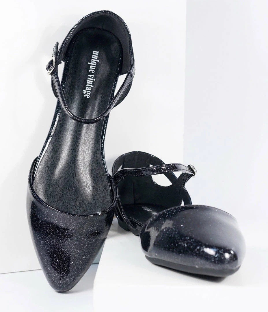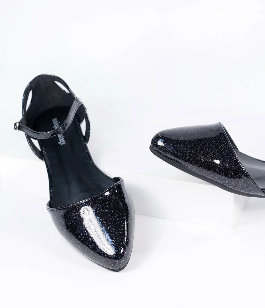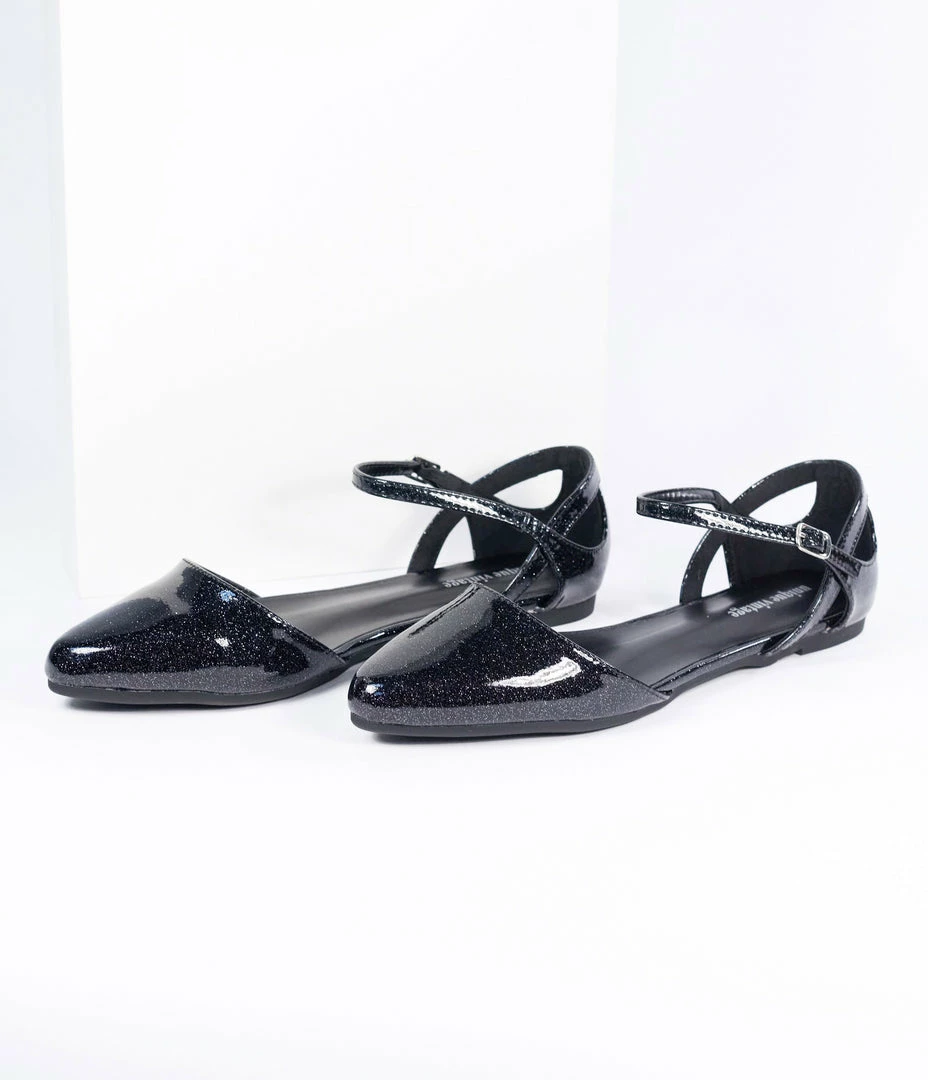 Sparkle and shine, dears! These sweet flats from Unique Vintage are crafted in a fabulous flexible black vinyl that shimmer with glitter throughout. The Libby Flats feature a d’Orsay cut with an adjustable ankle strap while the cushion insole keeps you comfortable all day!
