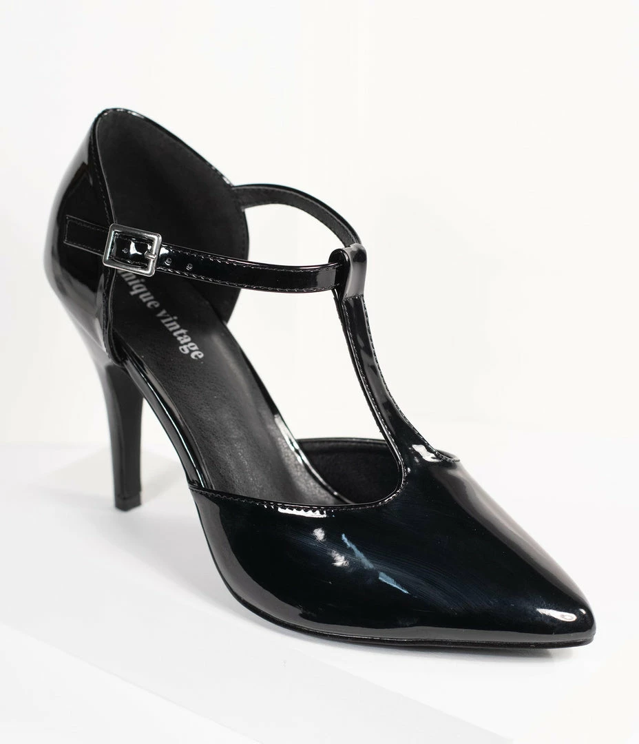 Unique Vintage Black Patent Leatherette T-Strap Heels