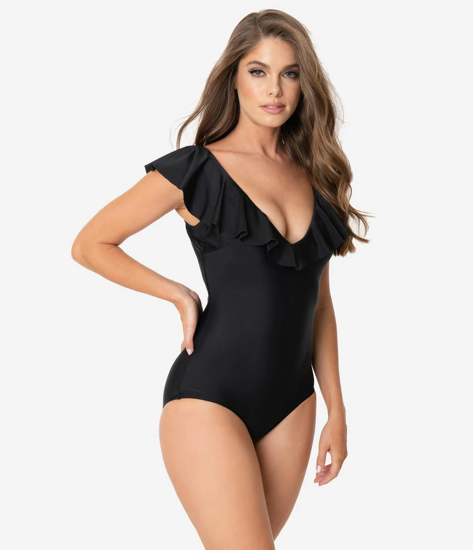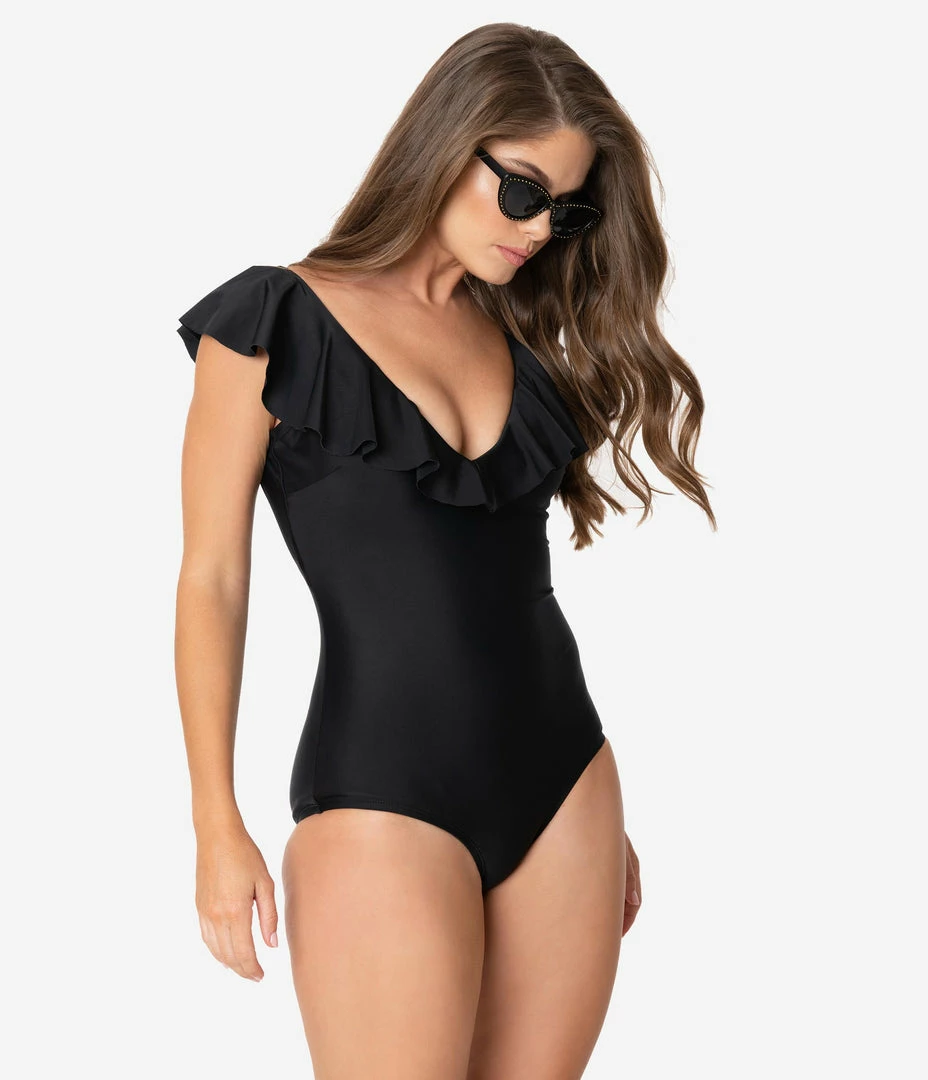 Unique Vintage Black Ruffle Newport One Piece Swimsuit Swimwear