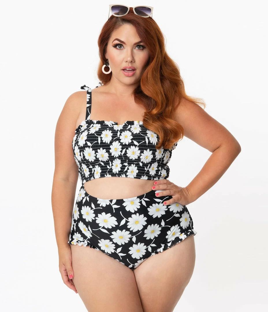 Enchantment them with infatuation, darling! This sweet swimsuit from Unique Vintage is a rockabilly wonder in a fabulous white daisy print set against a black backdrop. The smocked bodice features removable padding while the self tie straps and full mesh lining lend a flattering fit. A sweet cut out on the front and back provides eye-catching detail while dainty ruffles keep you feeling feminine!