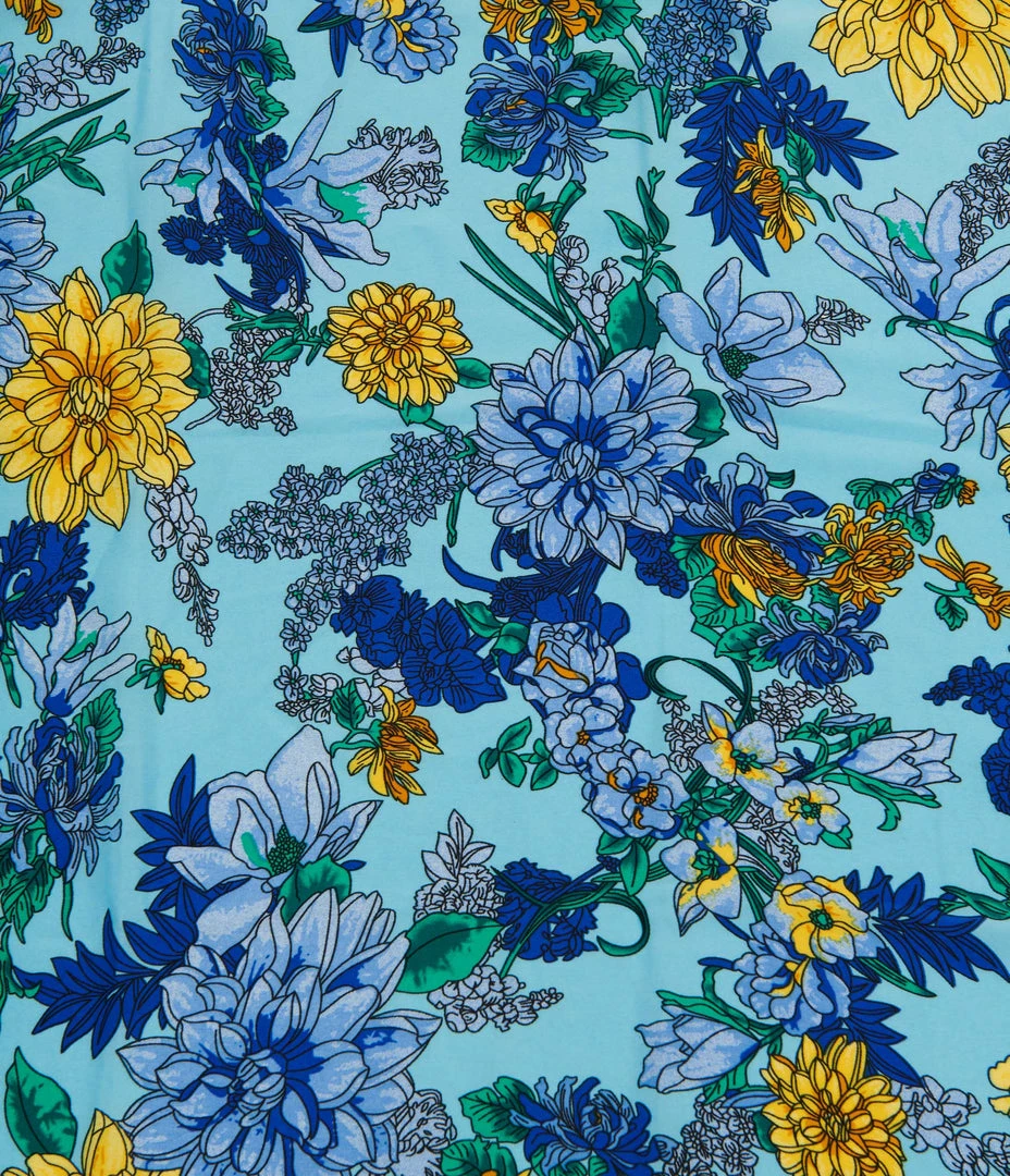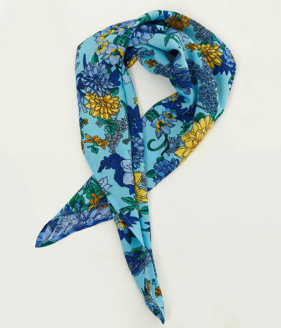 Complete your charming pin-up presentation with this fabulous hair scarf from Unique Vintage, dances with a multitude of blooming florals in shades blue and yellow! A silky vintage inspired chiffon scarf perfect for tying up and around your divine ‘do – any excuse for a little sky-high hair help!