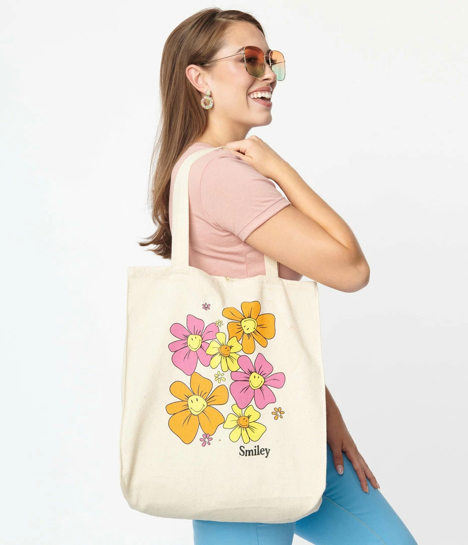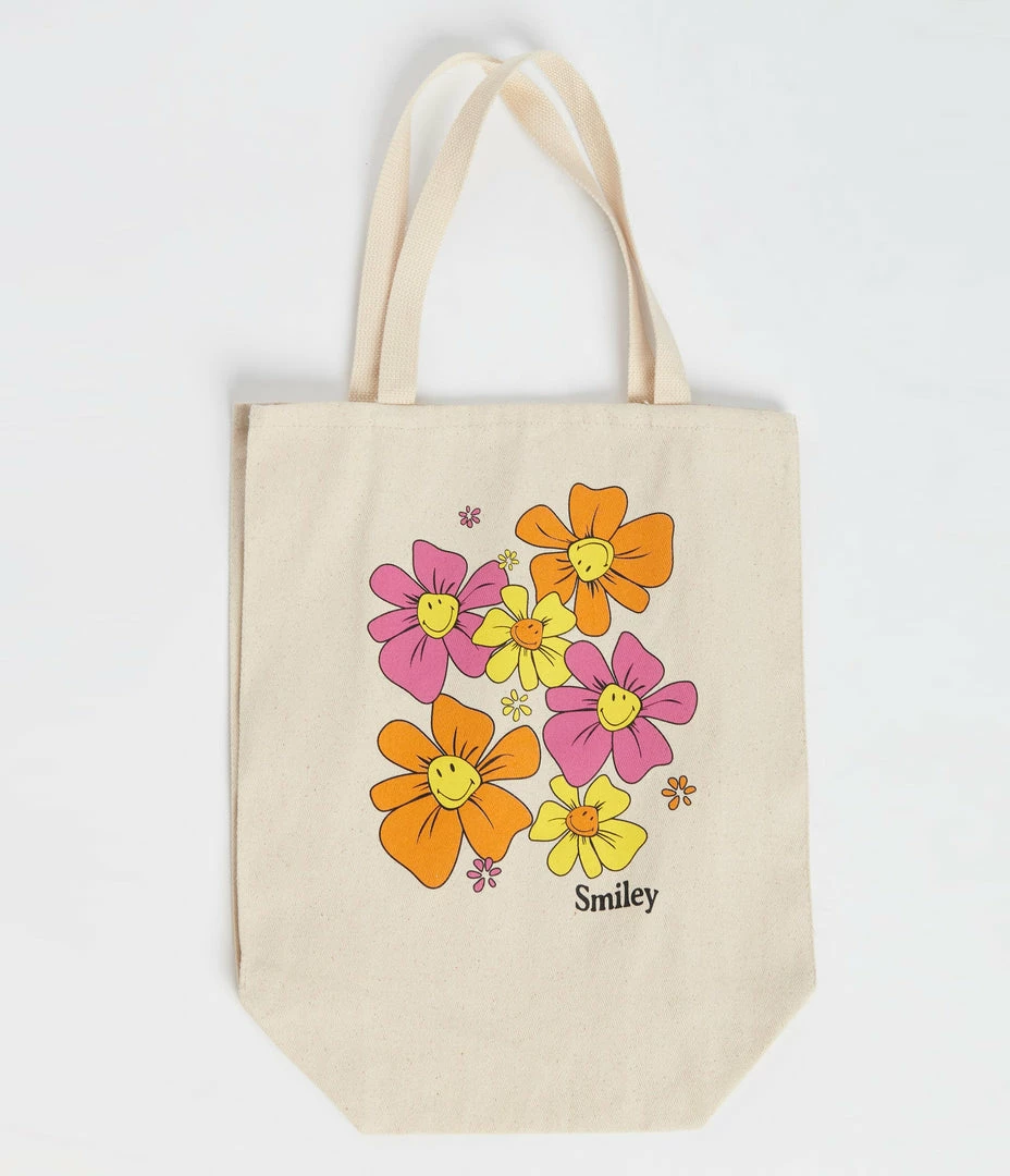 This cotton tote features a screen print of pink, orange, and yellow daises with the iconic Smiley® face in the center. Complete with dual top handles!