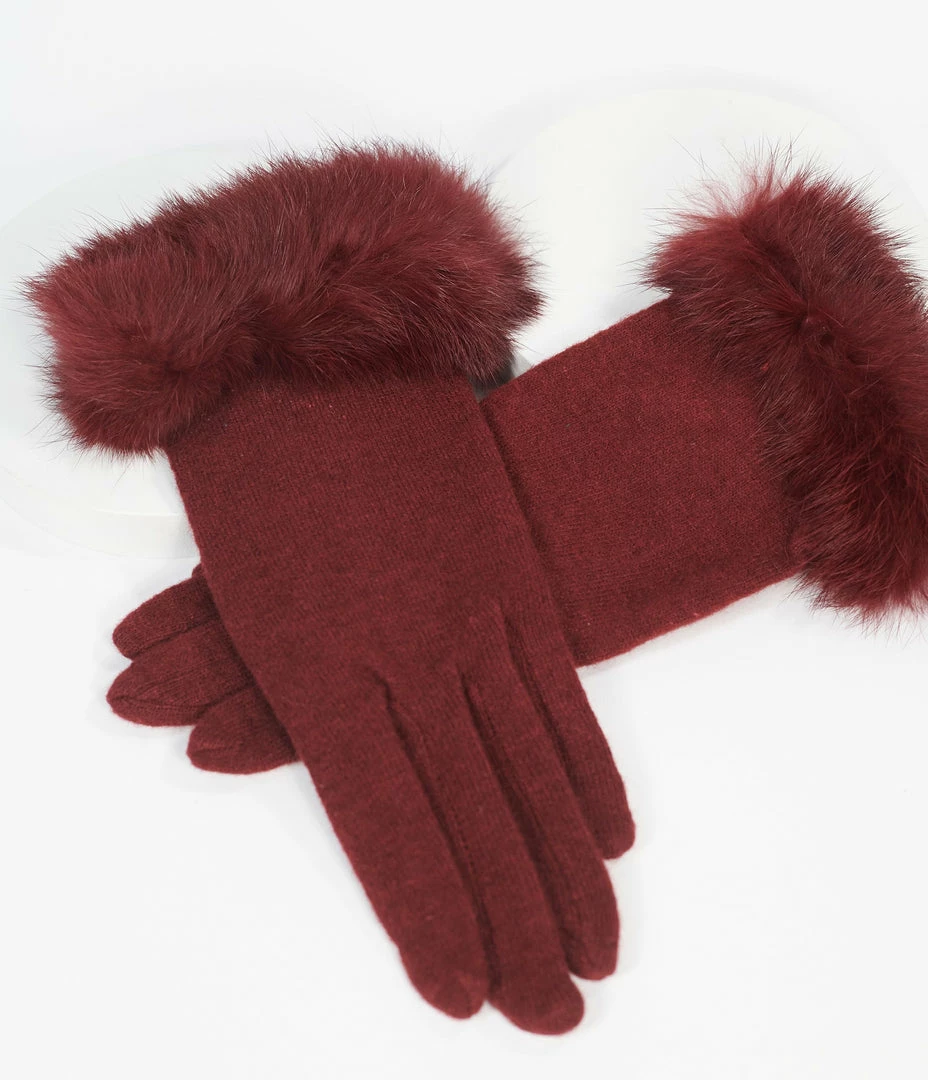 Unique Vintage Burgundy Wool & Fur Wrist Gloves
