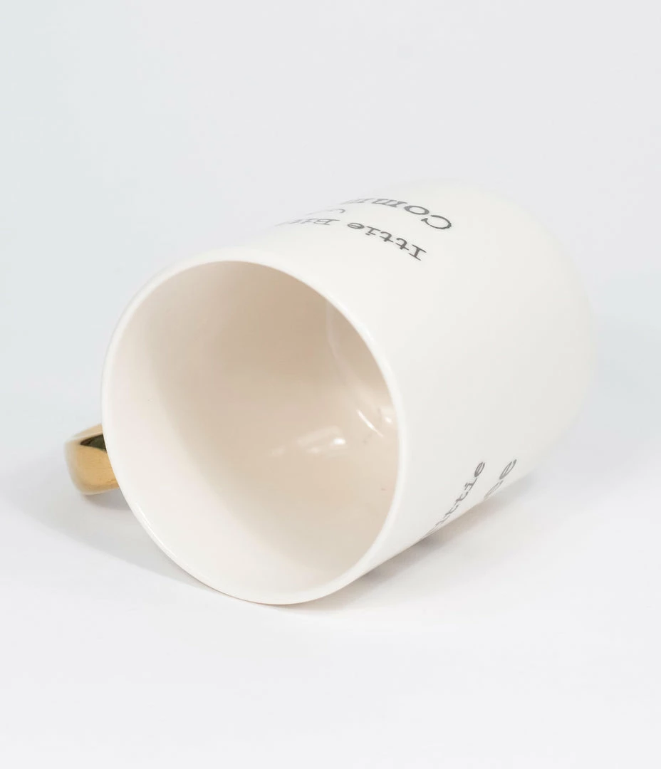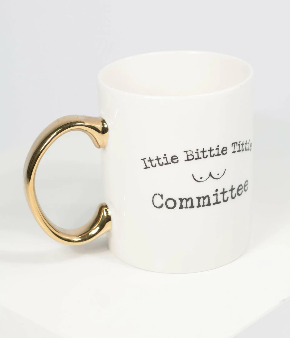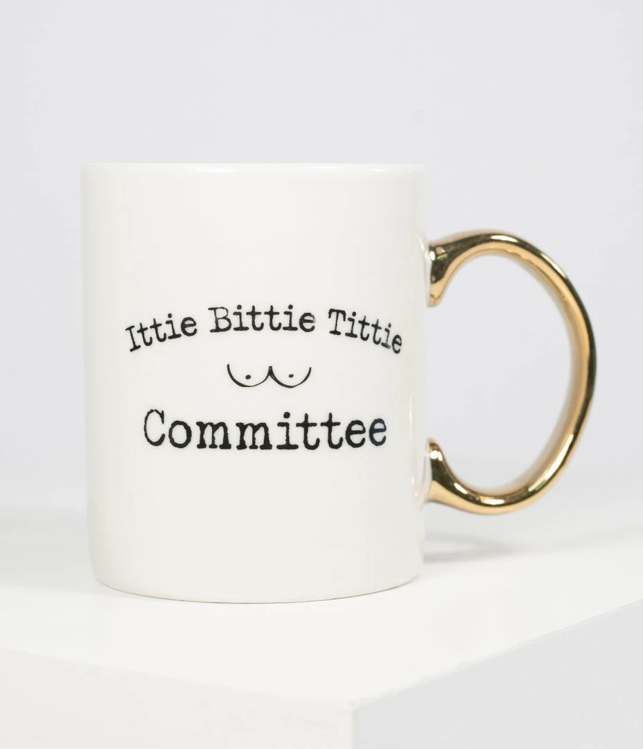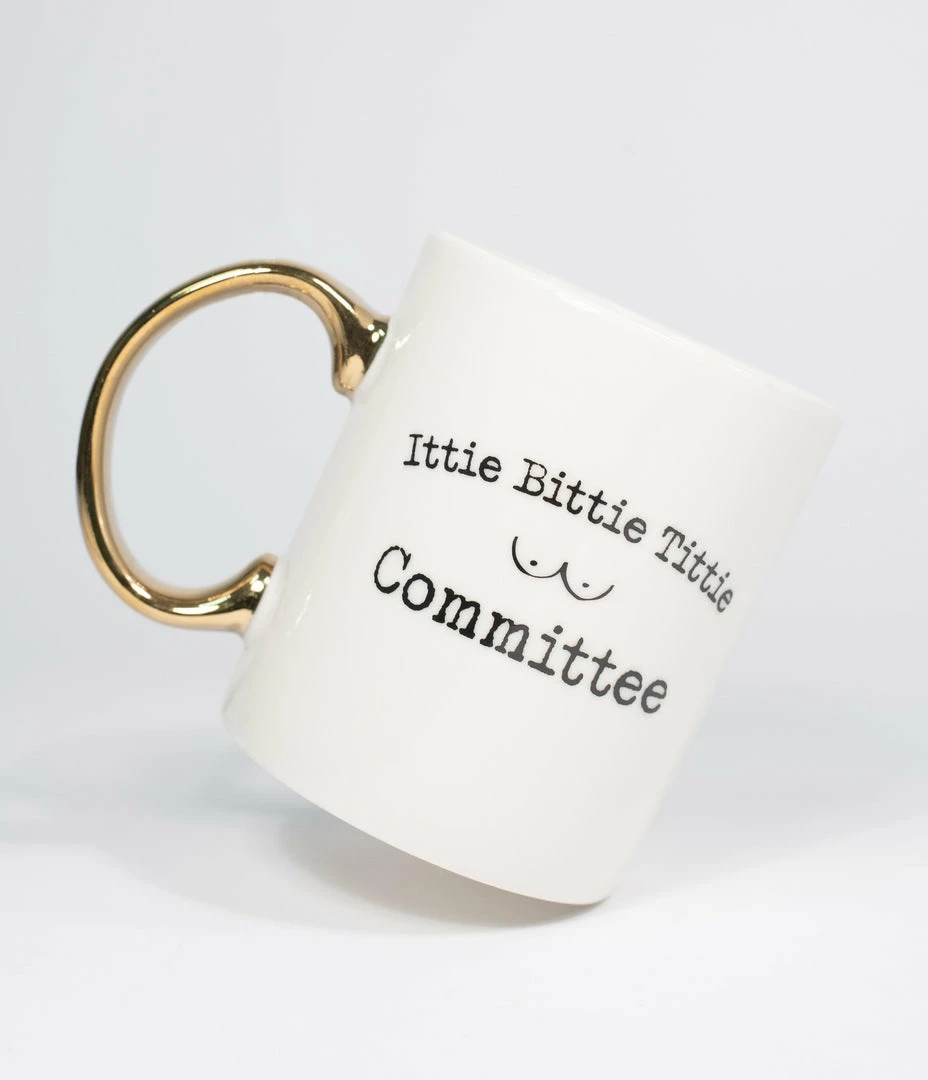 You’re the president, darling! This cheeky ceramic mug features a saucy print of boobs with the words, ‘Ittie Bittie Tittie Committee’ throughout the ivory backdrop. With a gold handle, remind yourself how badass your titties are!