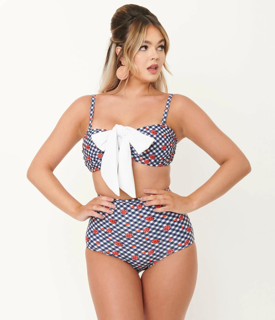 Unique Vintage Navy Gingham & Ladybug Print Rialto Bikini Top