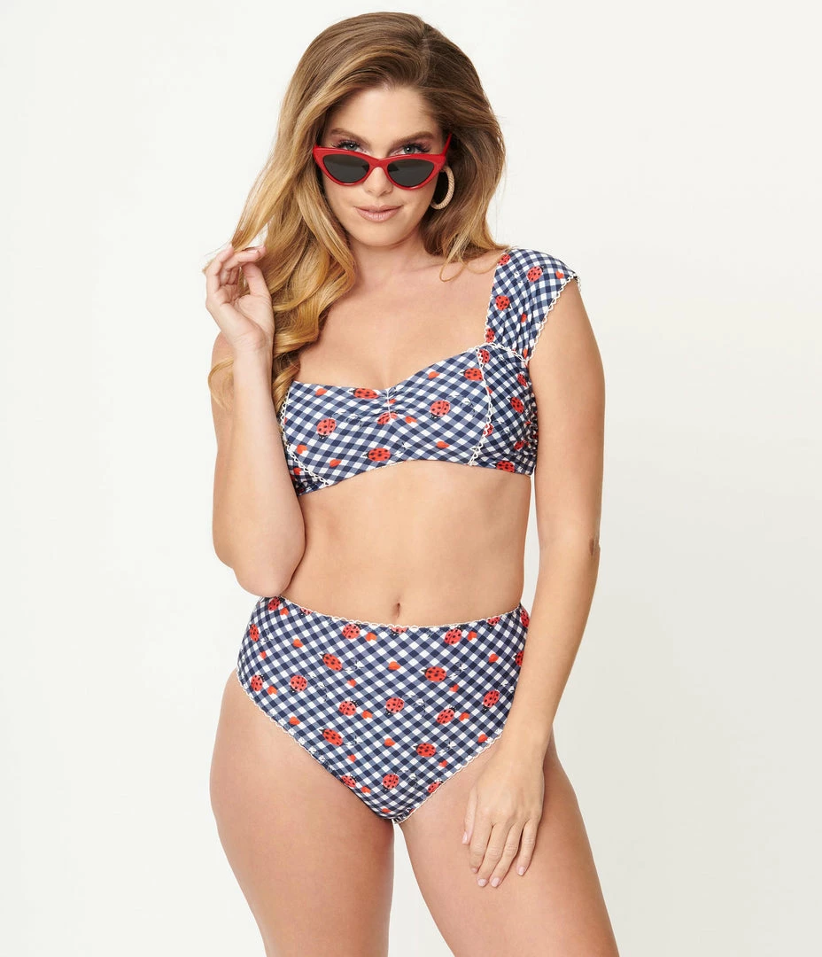Unique Vintage Navy Gingham & Ladybug Print Ruched & Ready Swim Top Swimwear