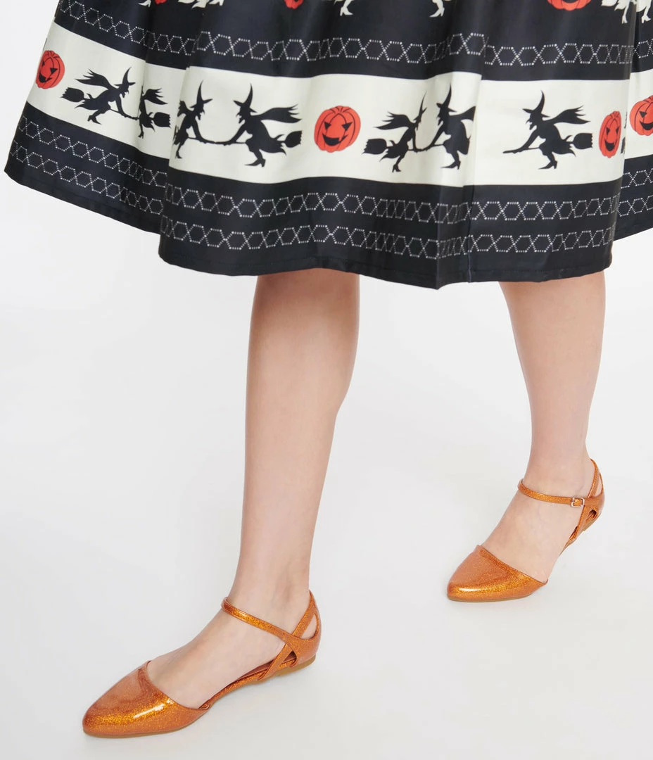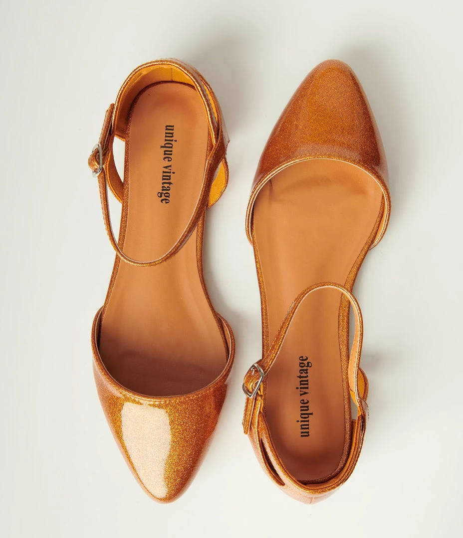 Sparkle and shine, dears! These sweet flats from Unique Vintage are crafted in a fabulous flexible orange vinyl that shimmer with glitter throughout. The Libby Flats feature a d’Orsay cut with an adjustable ankle strap while the cushion insole keeps you comfortable all day!