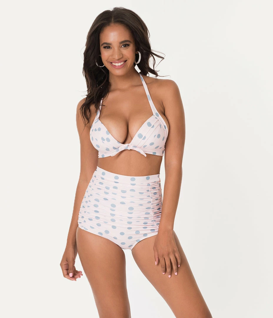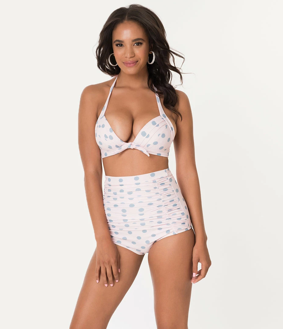 Unique Vintage Pink & Heather Blue Dotted Monroe Halter Swim Top