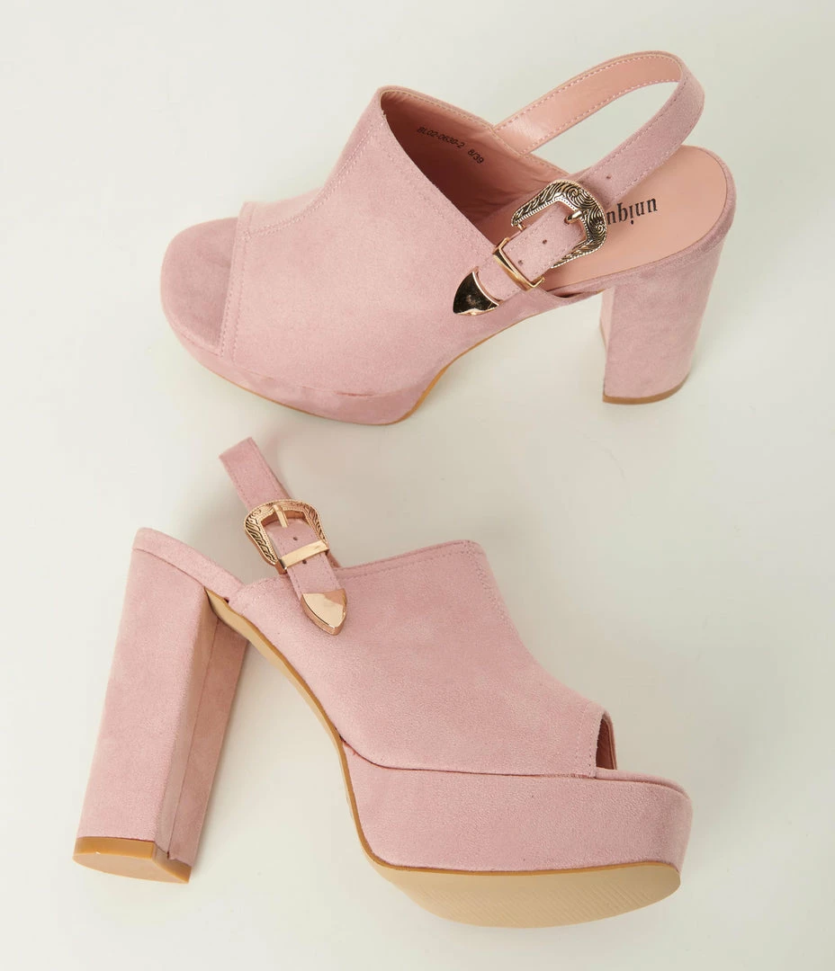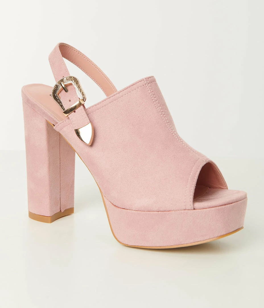 These feminine platform heels are crafted in a soft mauve pink faux suede and feature an adjustable buckle sling back strap and peep toes. Complete with a 1.5 inch platform and 5 inch block heels.