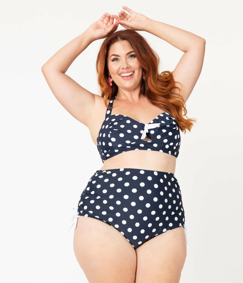Unique Vintage Plus Size 1950s Mrs. West Navy Blue & White Polka Dot Halter Swim Top