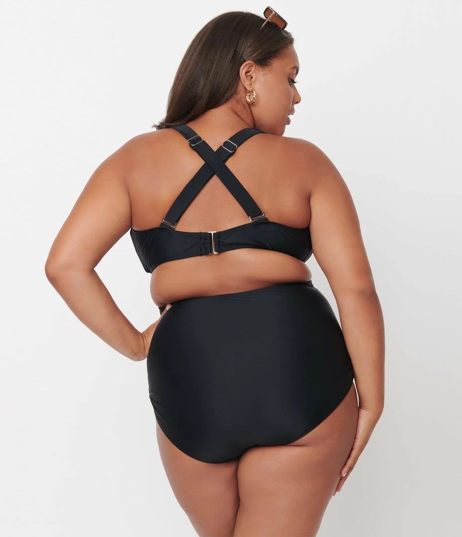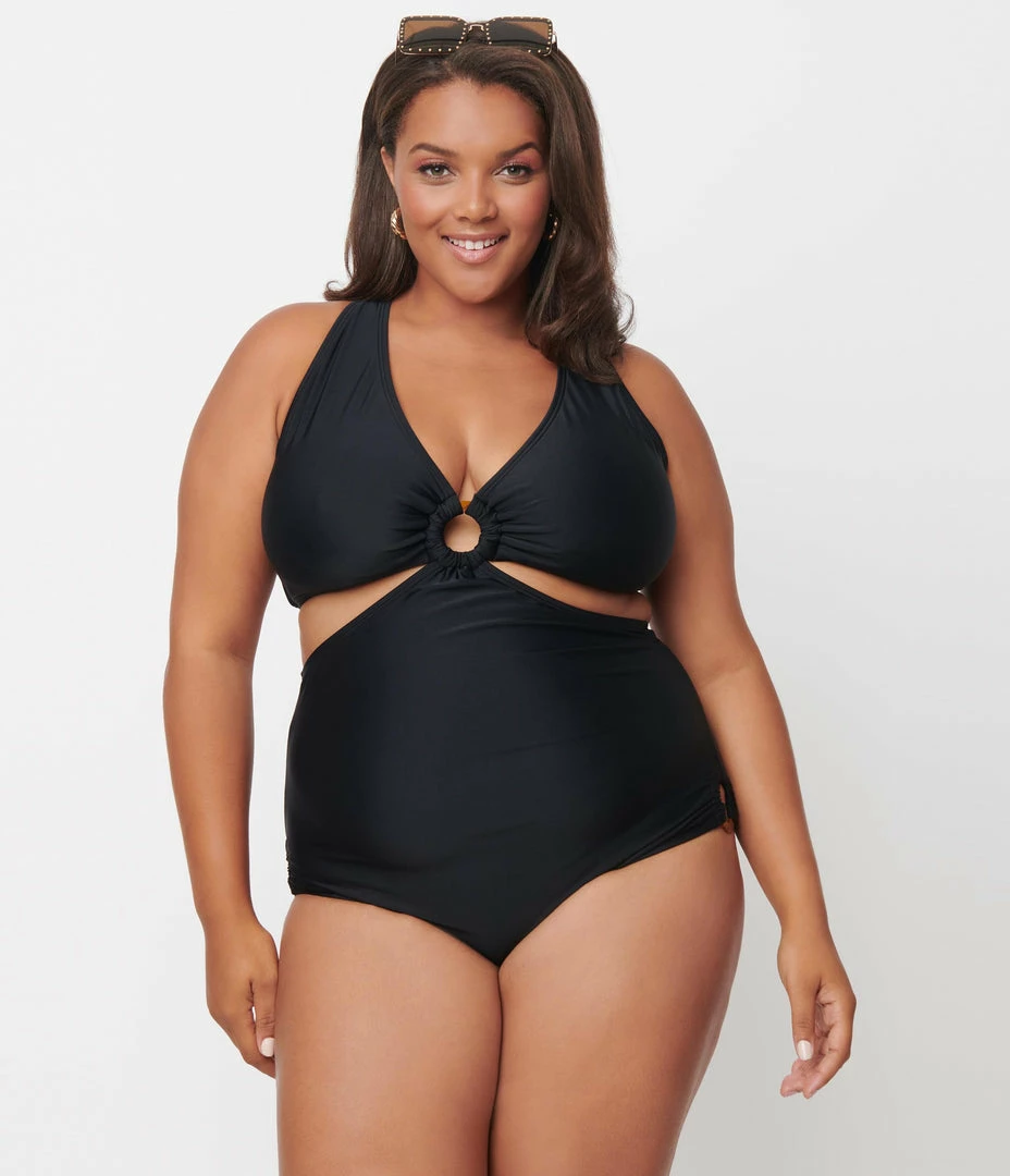 Choose your poolside partner wisely, darling! A sexy plus size one piece swimsuit from Unique Vintage, this sensational pin-up piece is set in a solid black and boasts a ravishing cutout style for retro vibes. A center ring draws all eyes your way while the adjustable straps and hook back provide a comfortable fit. The low cut legs feature a matching ring and are fully mesh lined for all day comfort!