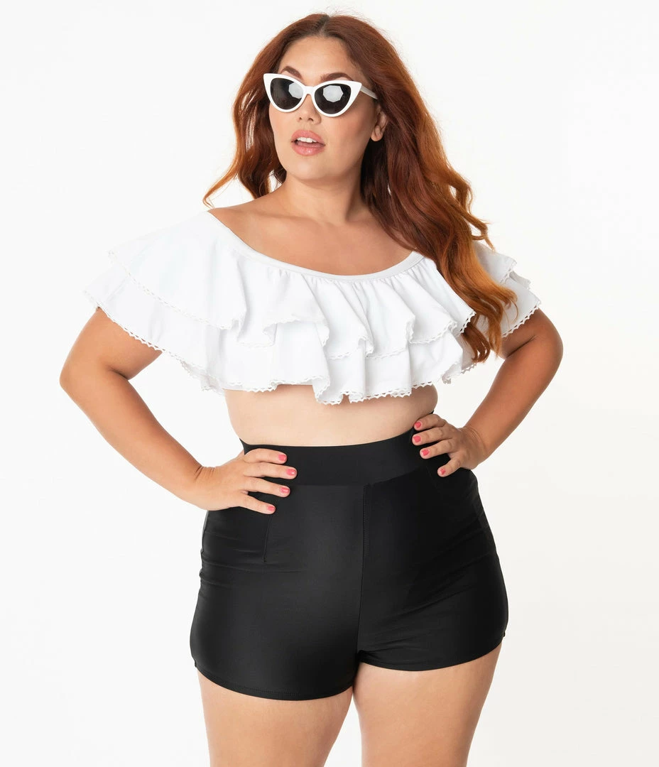 Unique Vintage Plus Size Black High Waist Capitola Swim Shorts Swimwear