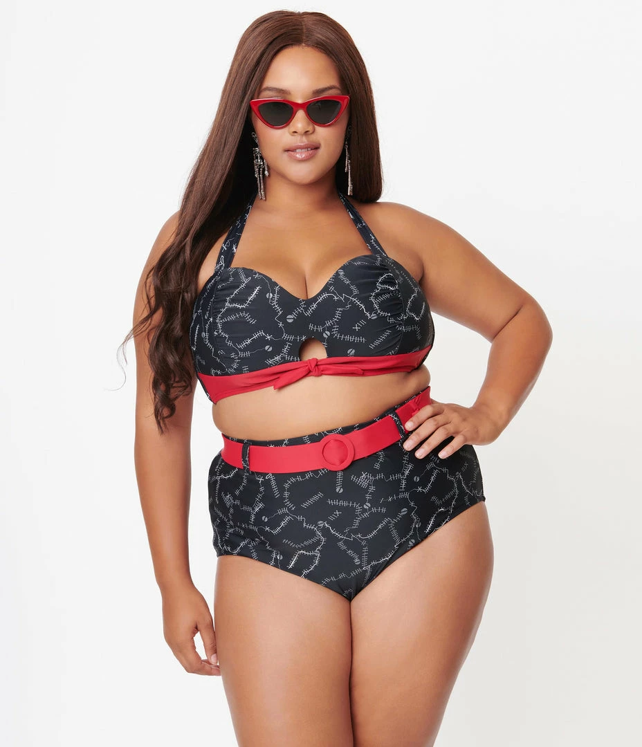 Check yourself out with Mrs. West, darlings! The thrilling plus size Mrs. West swim top from Unique Vintage is crafted in a spooky white stitches print and black backdrop, perfect for your reanimated poses. A sweet red bow adorned keyhole on the front provides additional vintage stylings in a modern design. Subtle front gathers are complemented by mesh lining, an adjustable back, and red band across the chest while the soft, wide halter straps and sewn in padding lend comfort and confidence!