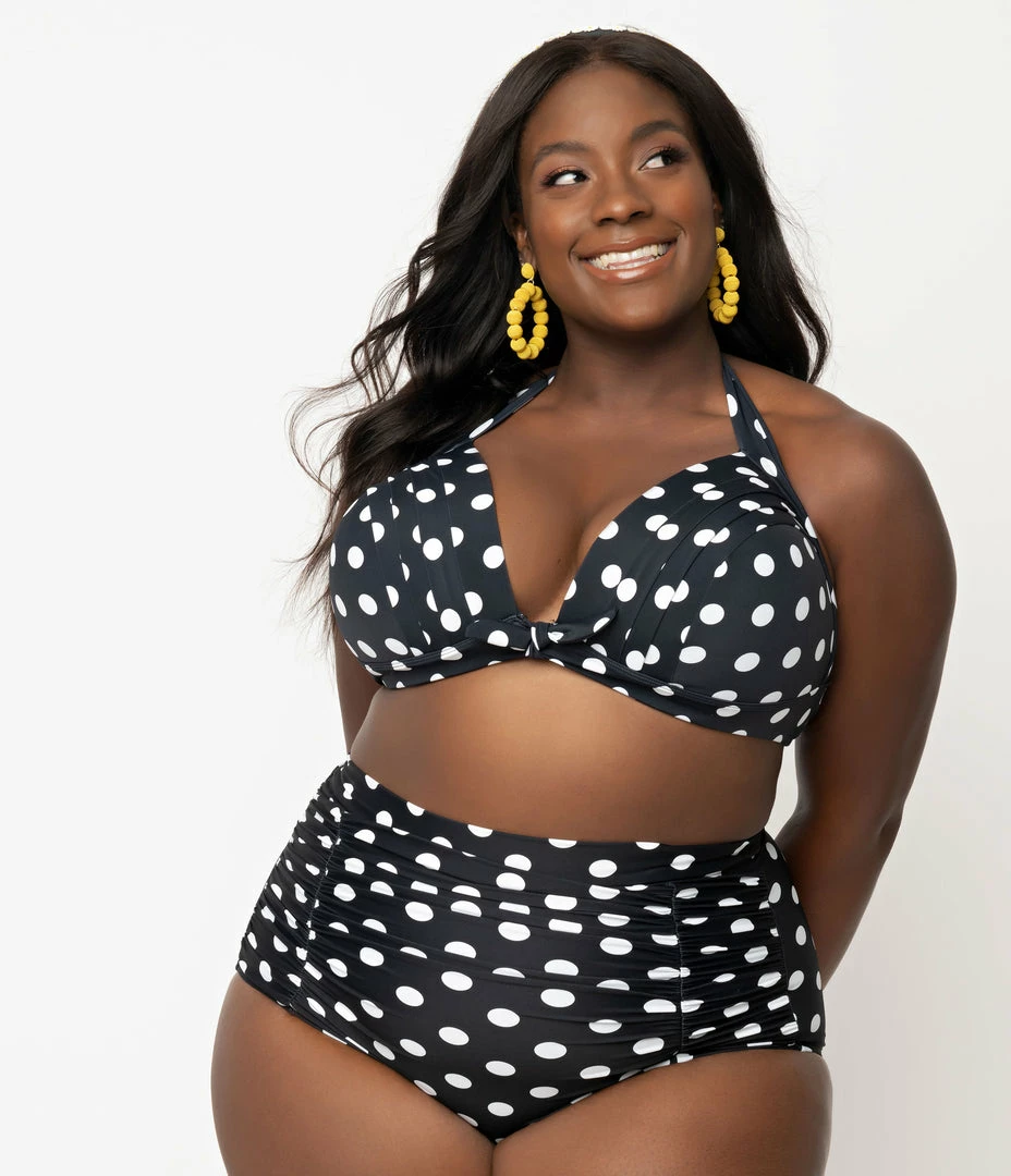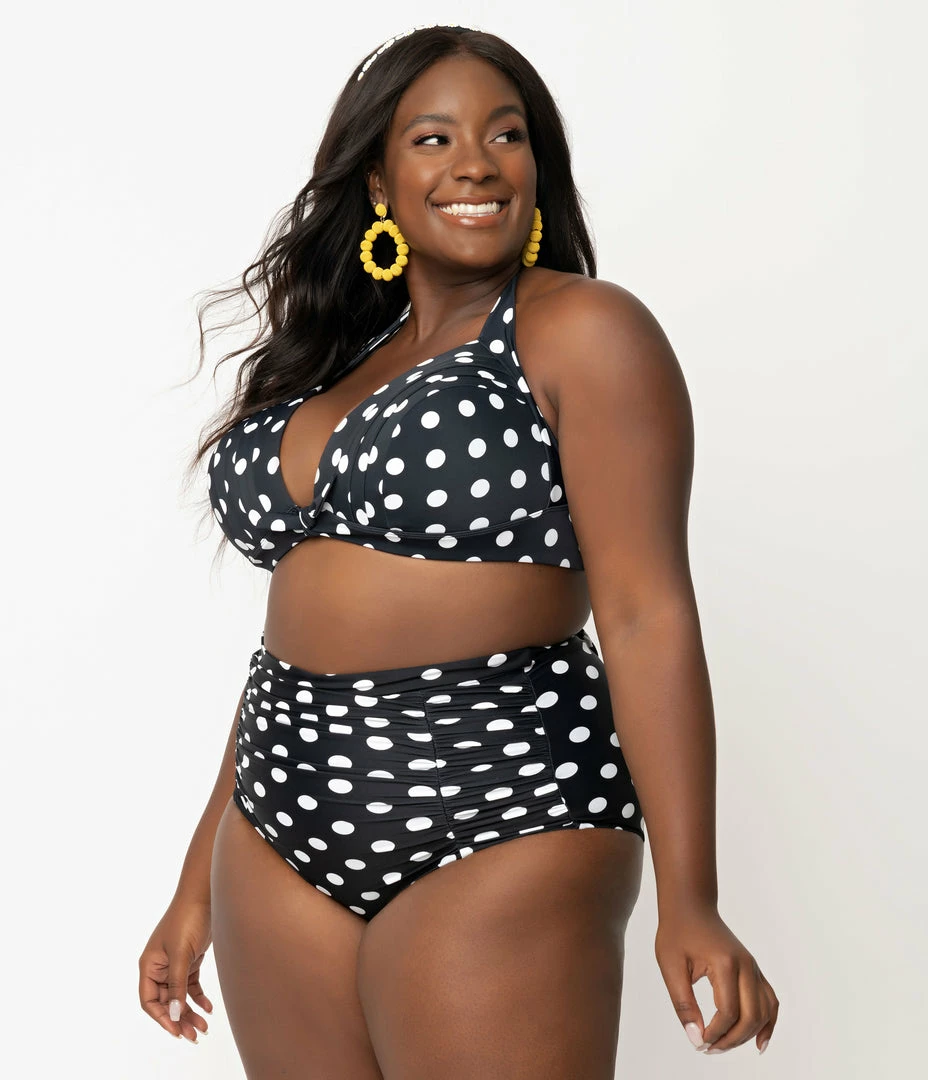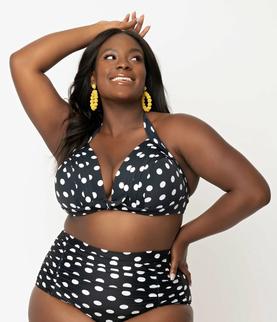 Unique Vintage Plus Size Black & White Polka Dot Print Monroe Halter Bikini Top Swimwear