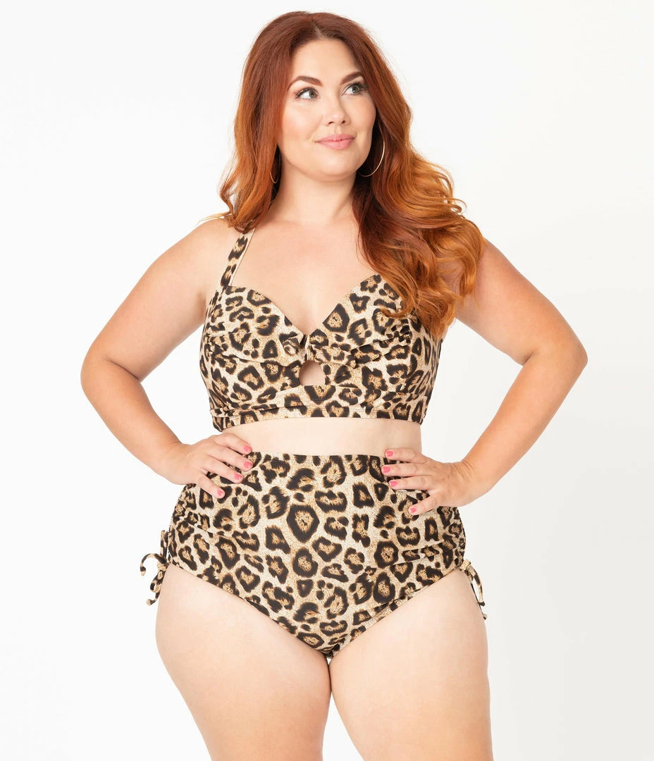 Instant delight, just add water! This sweet plus size swim bottom from Unique Vintage is a fabulous vintage addition to your summer lounging in a ravishing leopard print. The full mesh lined, high waisted bottom boasts adorable pull ties on the side for versatile style!