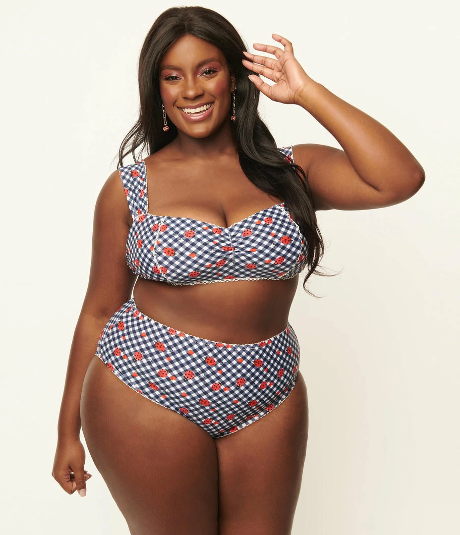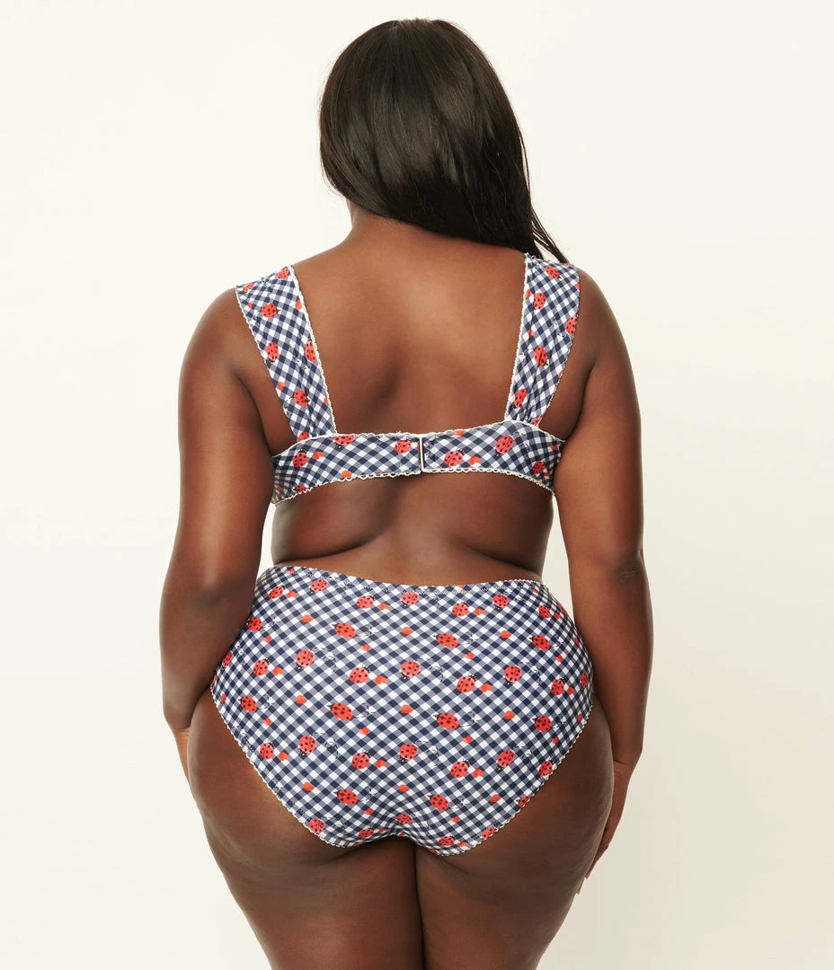 Unique Vintage Plus Size Navy Gingham & Ladybug Print Ruched & Ready Swim Top Swimwear