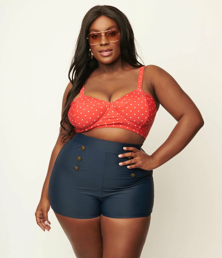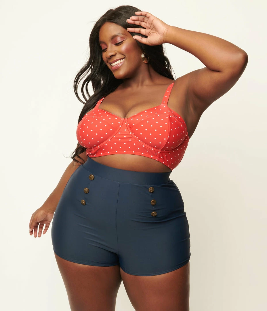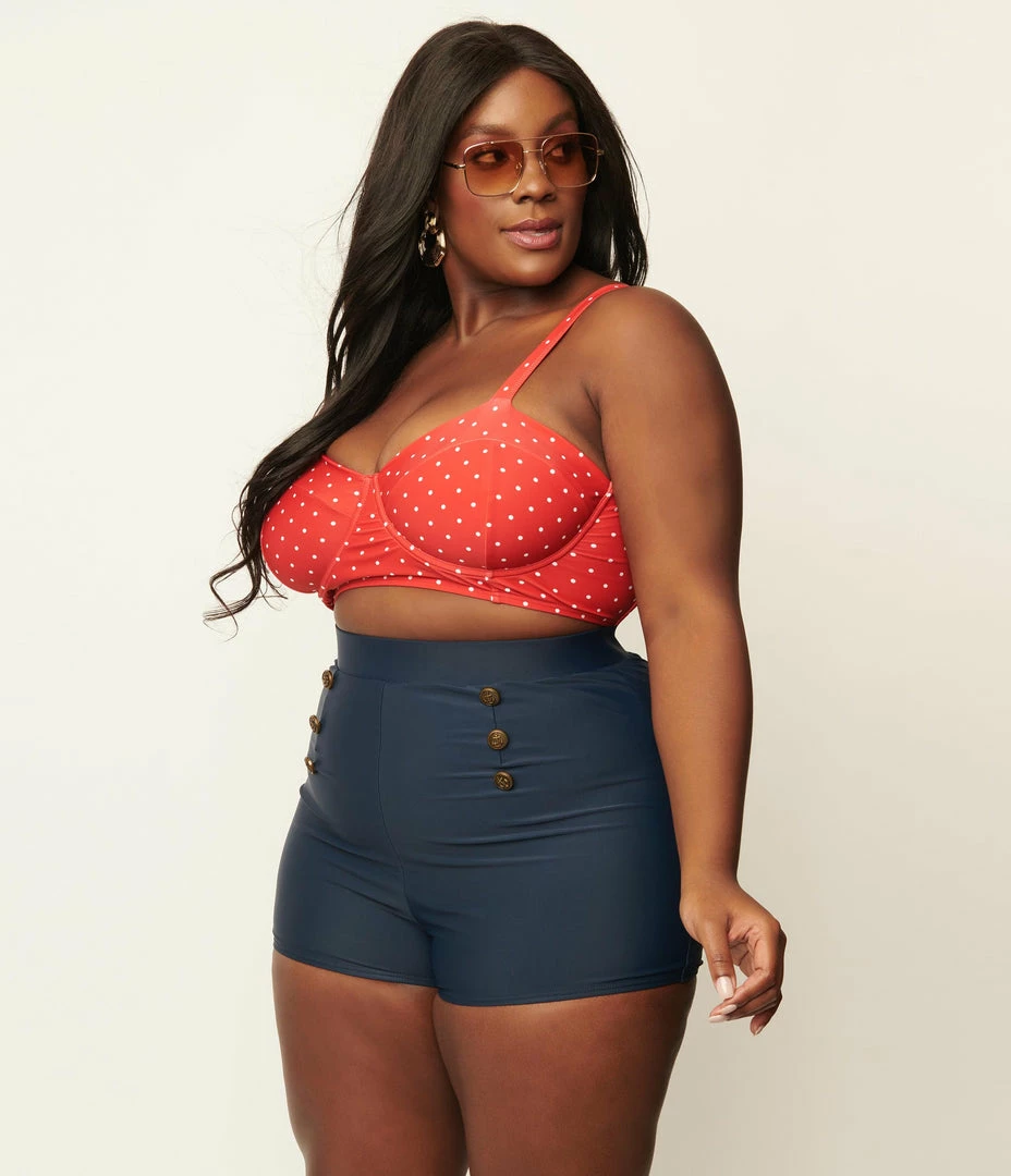 Unique Vintage Plus Size Red & White Pin Dot Marlene Crop Swim Top