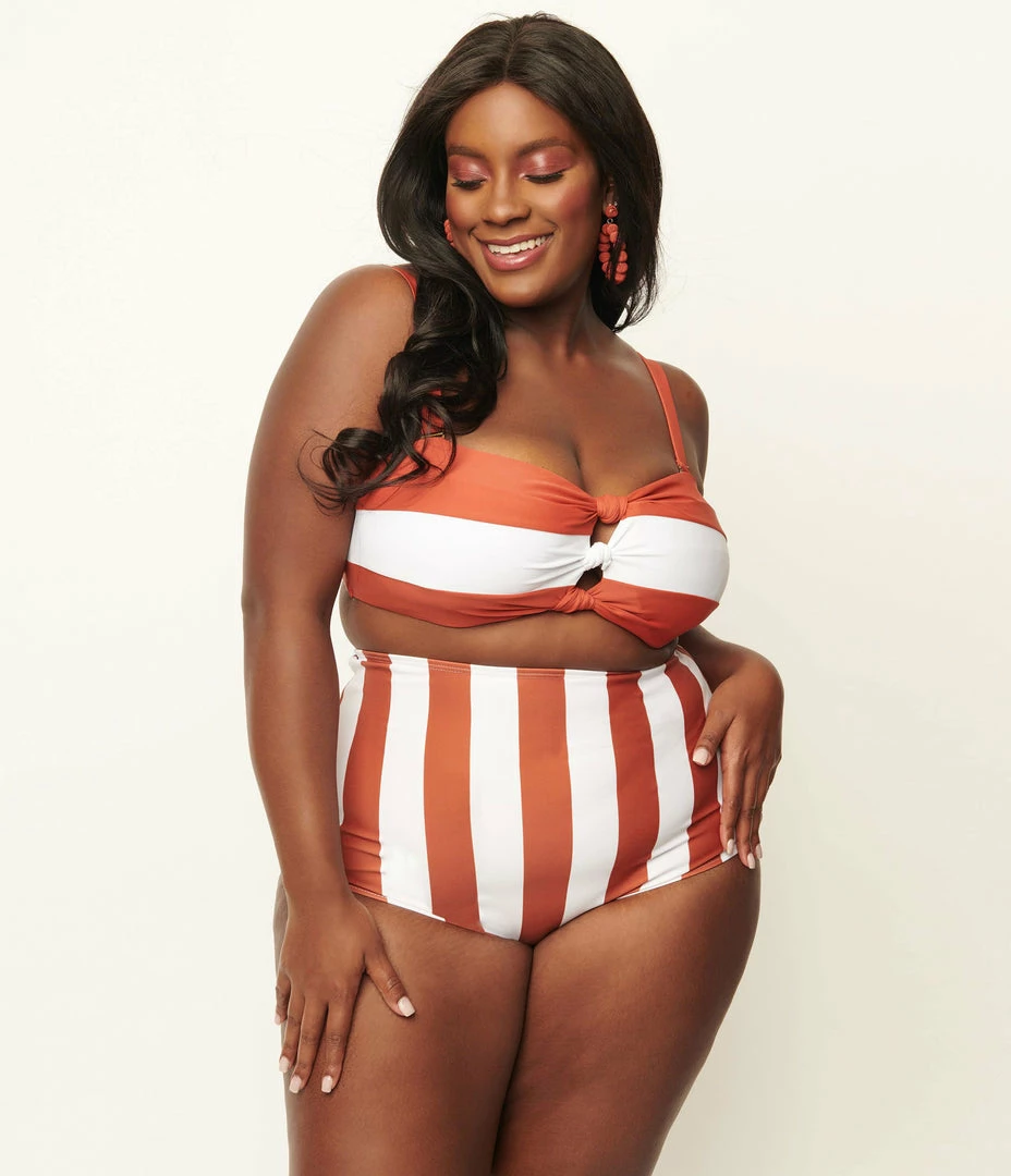 Unique Vintage Plus Size Rust & White Stripe Knot So Fast Swim Top