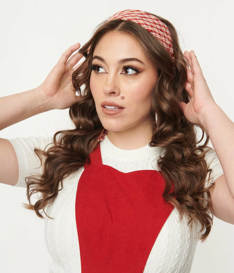 Complete your flirtatious pin-up presentation with this fabulous hair scarf from Unique Vintage, boasting a bevy of red hearts throughout the ivory and red plaid backdrop! A silky vintage inspired chiffon scarf perfect for tying up and around your divine ‘do – any excuse for a little sky-high hair help!