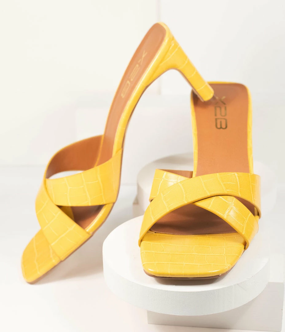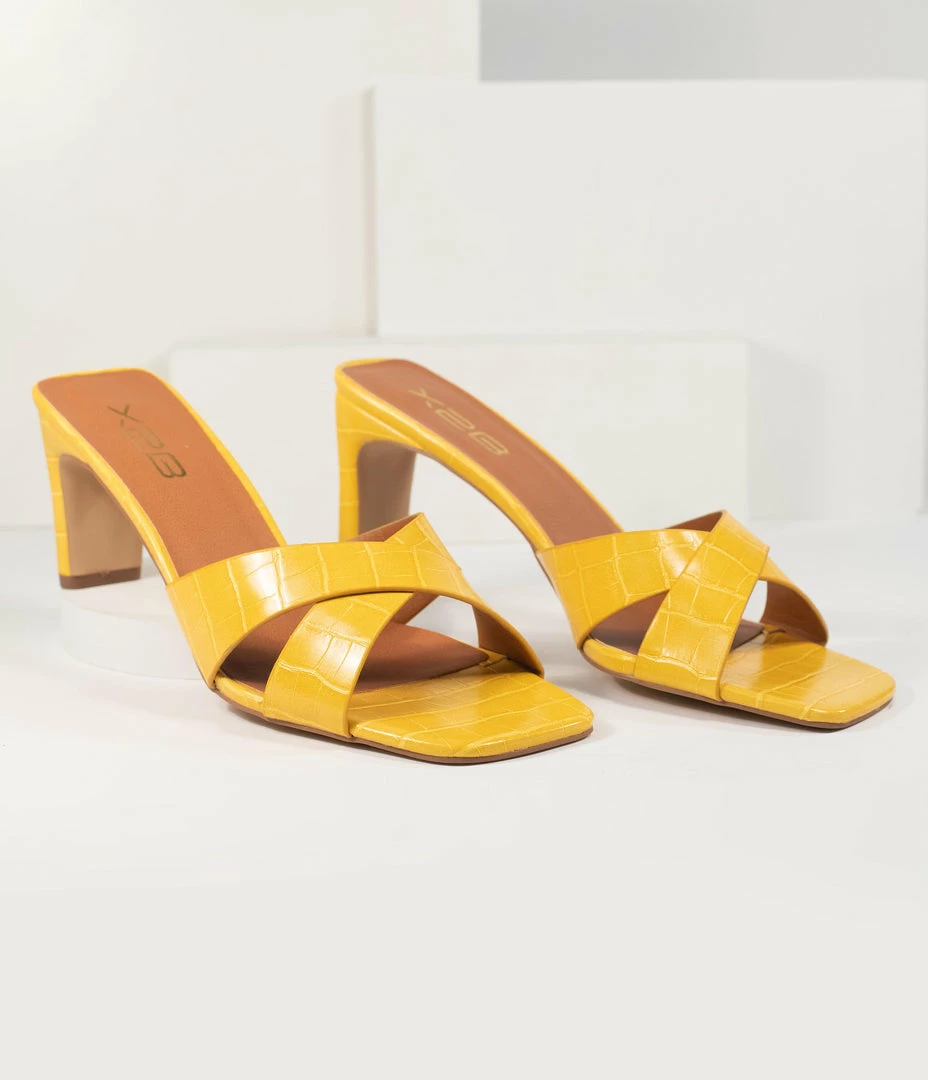 A dainty lift! These adorable slip ons are crafted in a fabulous mustard yellow leatherette, embossed with a retro crocodile pattern throughout. The cross strapped vamp showcases your toes while the 3 inch heel provides darling feminine support!