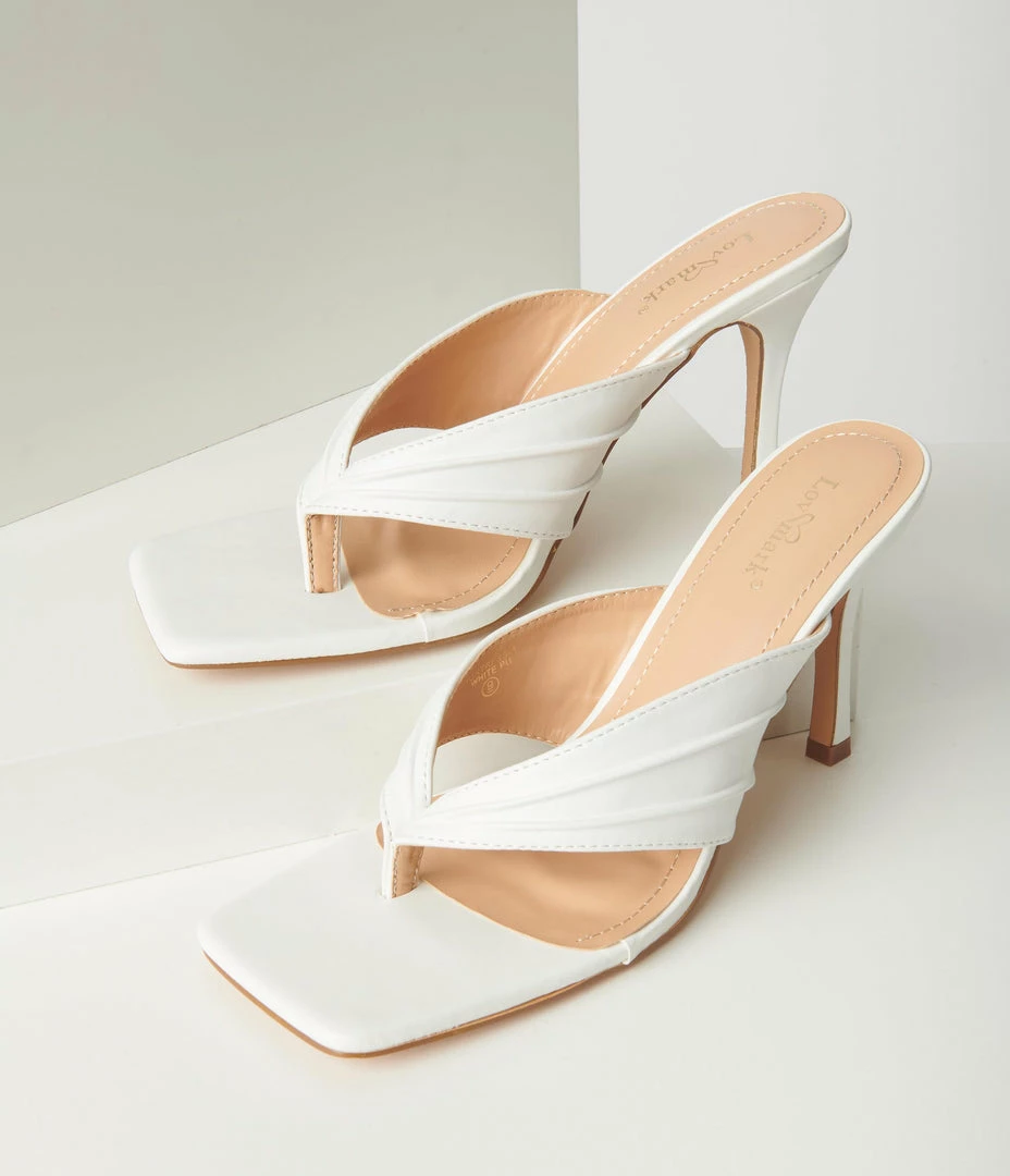 For fabulous frolics, these dainty slip on sandals are crafted in white leatherette and feature a pleated sandal vamp, 4 inch stiletto heel, and a cushion insole!
