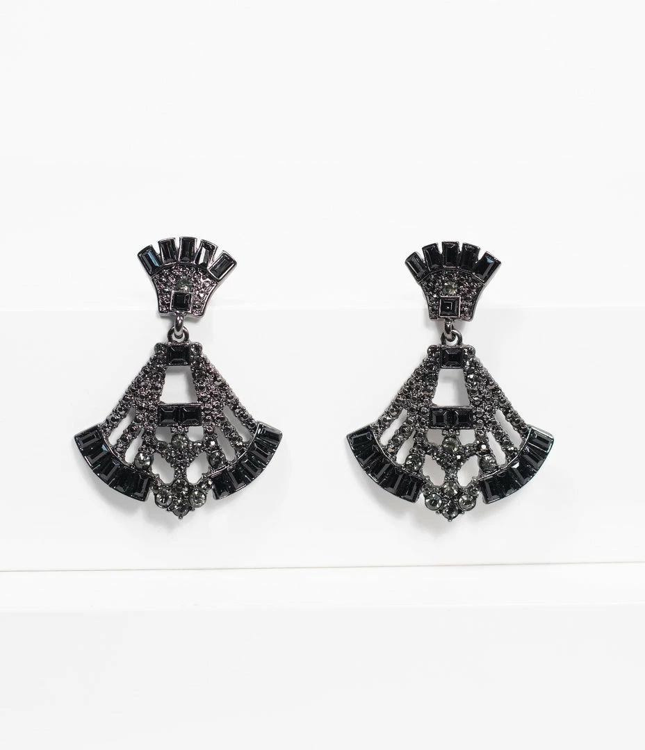 These sparkling and mysterious set of deco styled drop earrings feature beautiful glittering black and gunmetal gems and crystals that will instantly up the ante on your flapper ensemble. Styled in classic vintage fan styles, these dangling beauties secure with post backs.