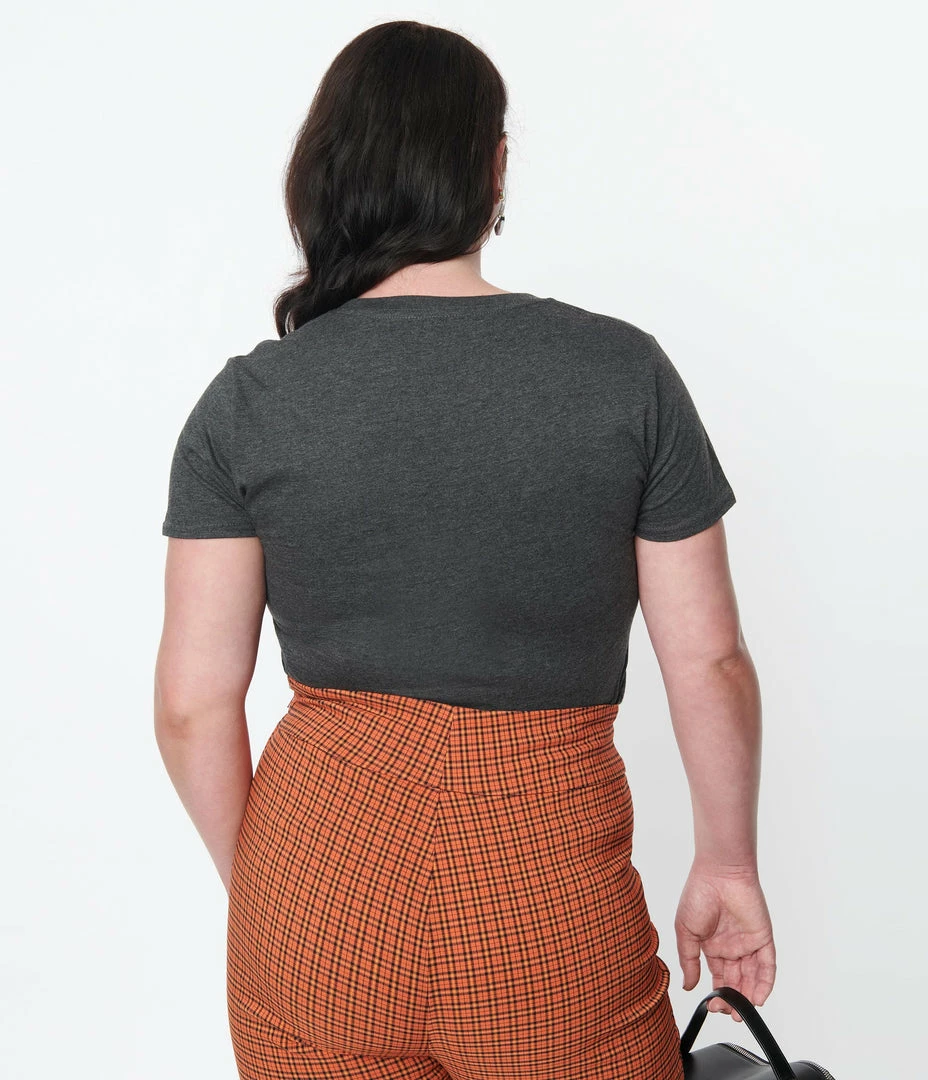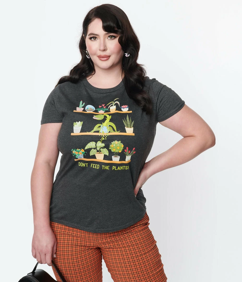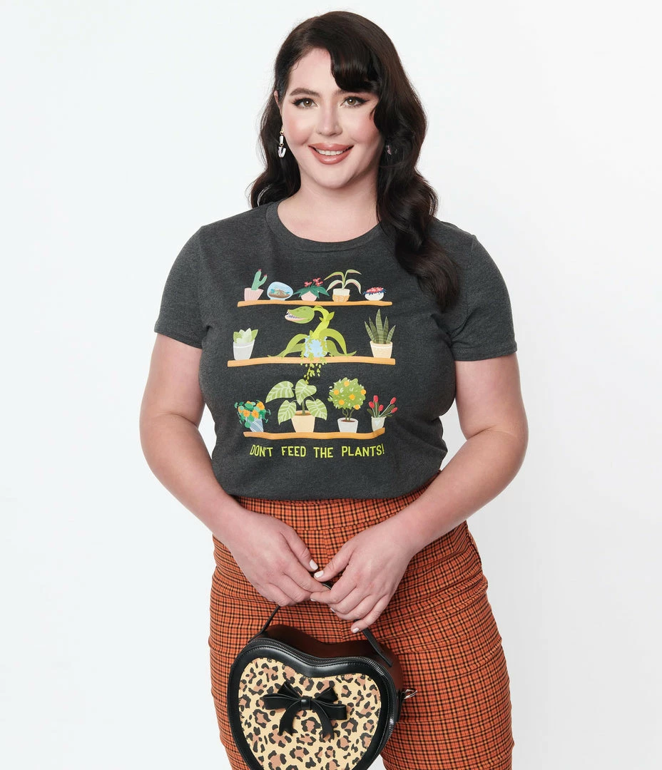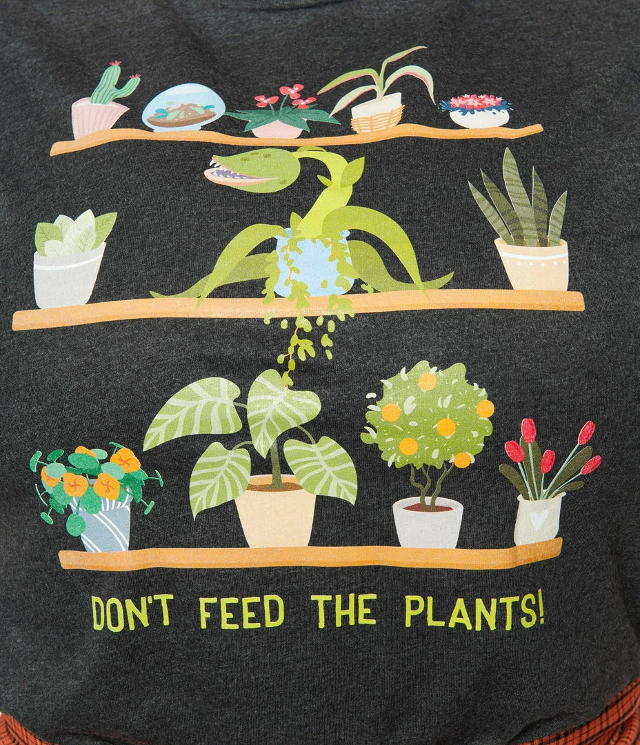 For the horrifying plant mom, this charcoal grey cotton tee features shelves of house plants and the words, ‘Don’t Feed The Plants!’. Complete with a crew neckline and short sleeves.