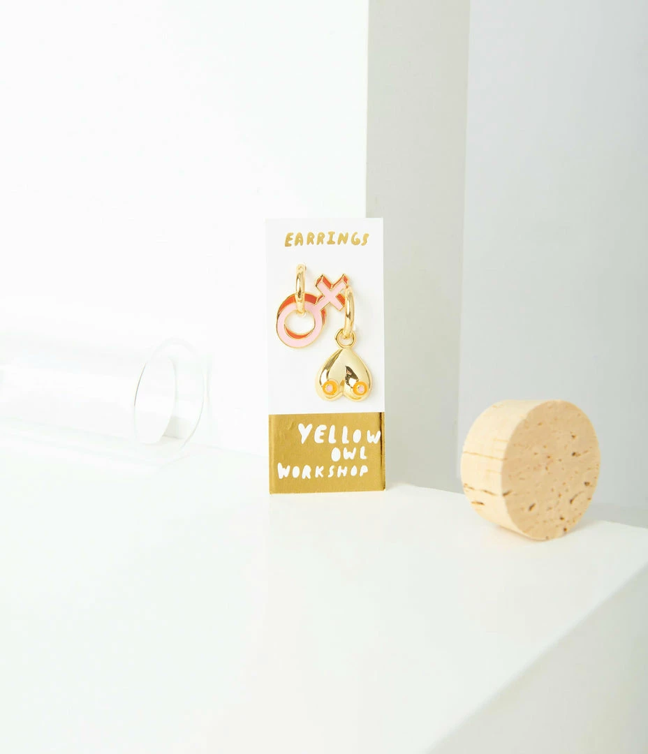 Your body, your choice, darling! These dainty earrings are set in 18K gold gilt and features a pink enamel female gender symbol on one and liberated boobs on the other. Secured with a hinged clasp hoop for all day wear!