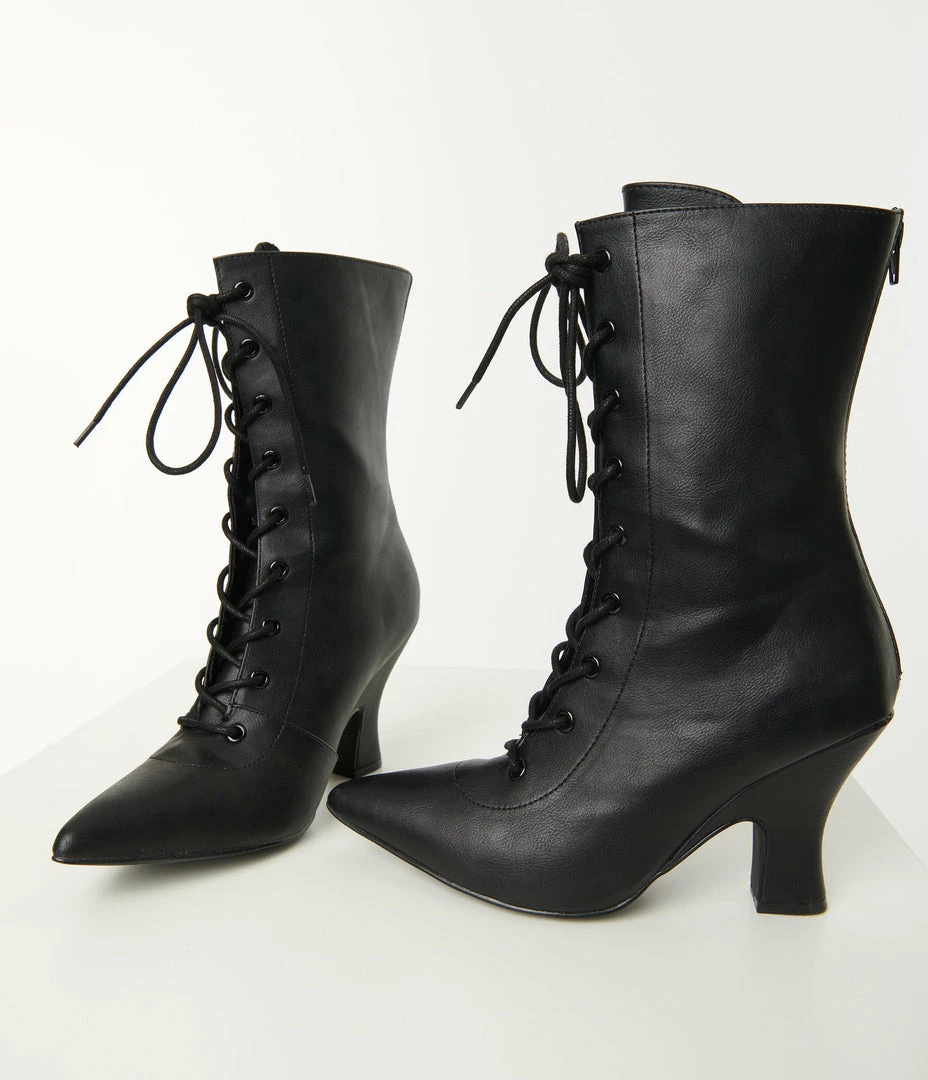 For important coven duties, these black leatherette boots feature a potted toe, lace up front, and a back zipper. Complete with a 3.5 inch heel and cushion insole.
