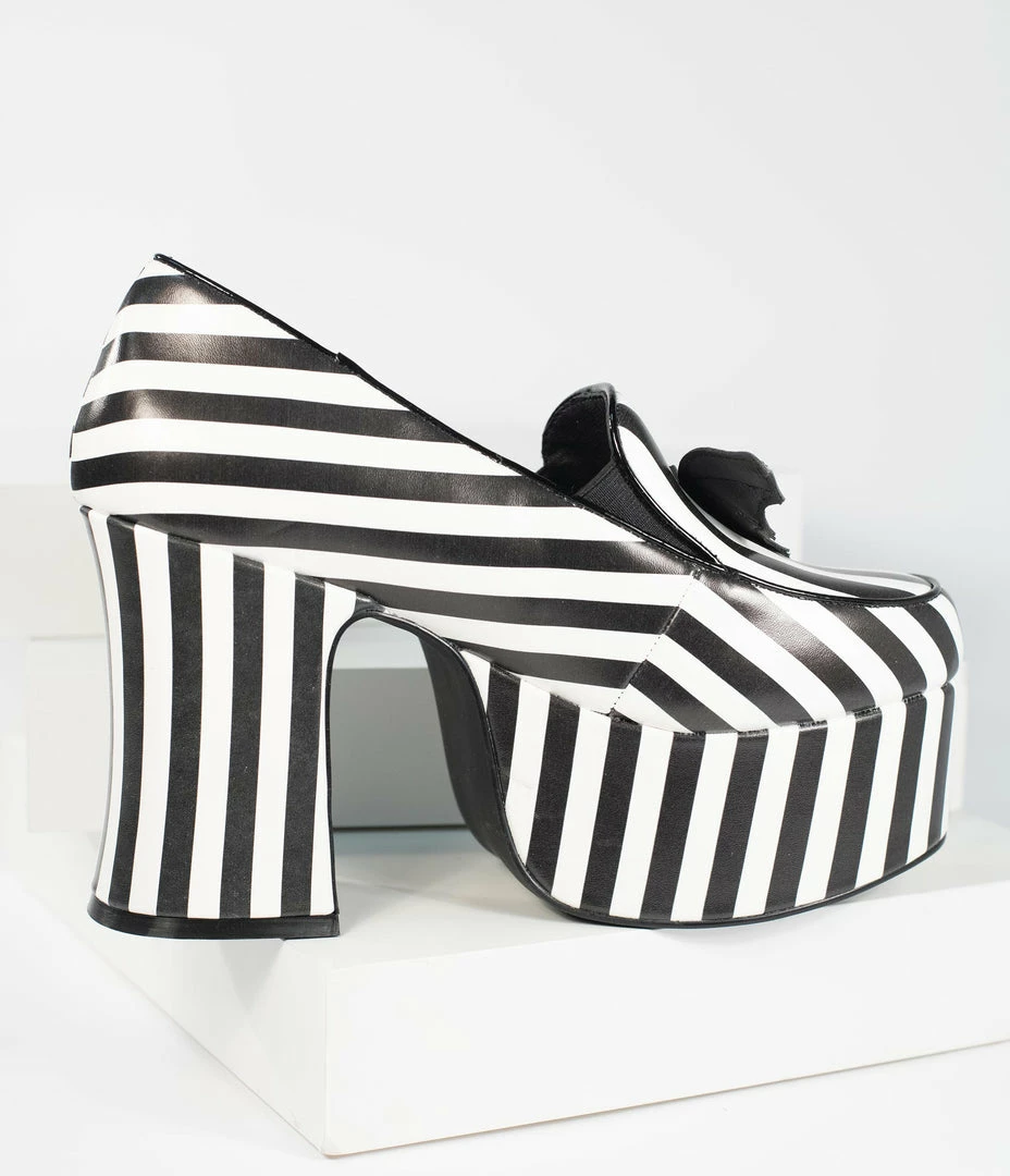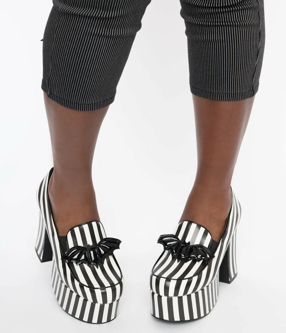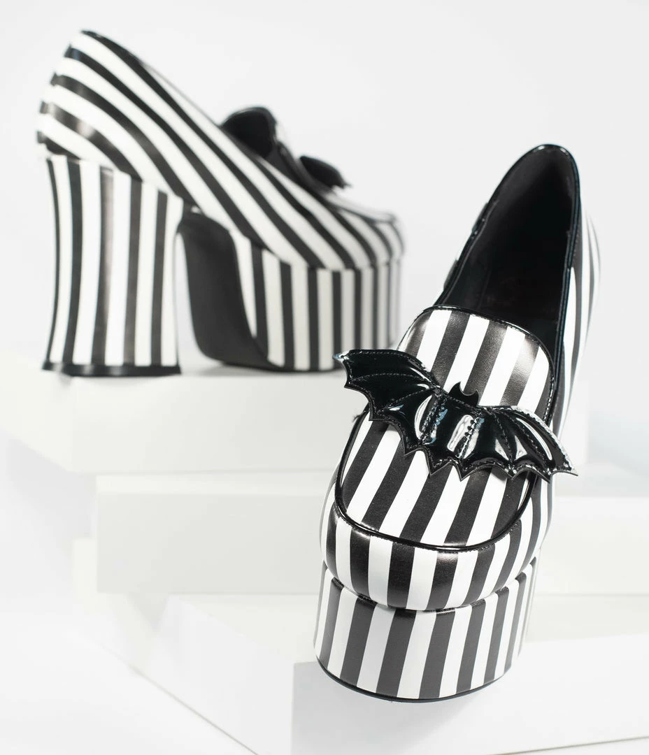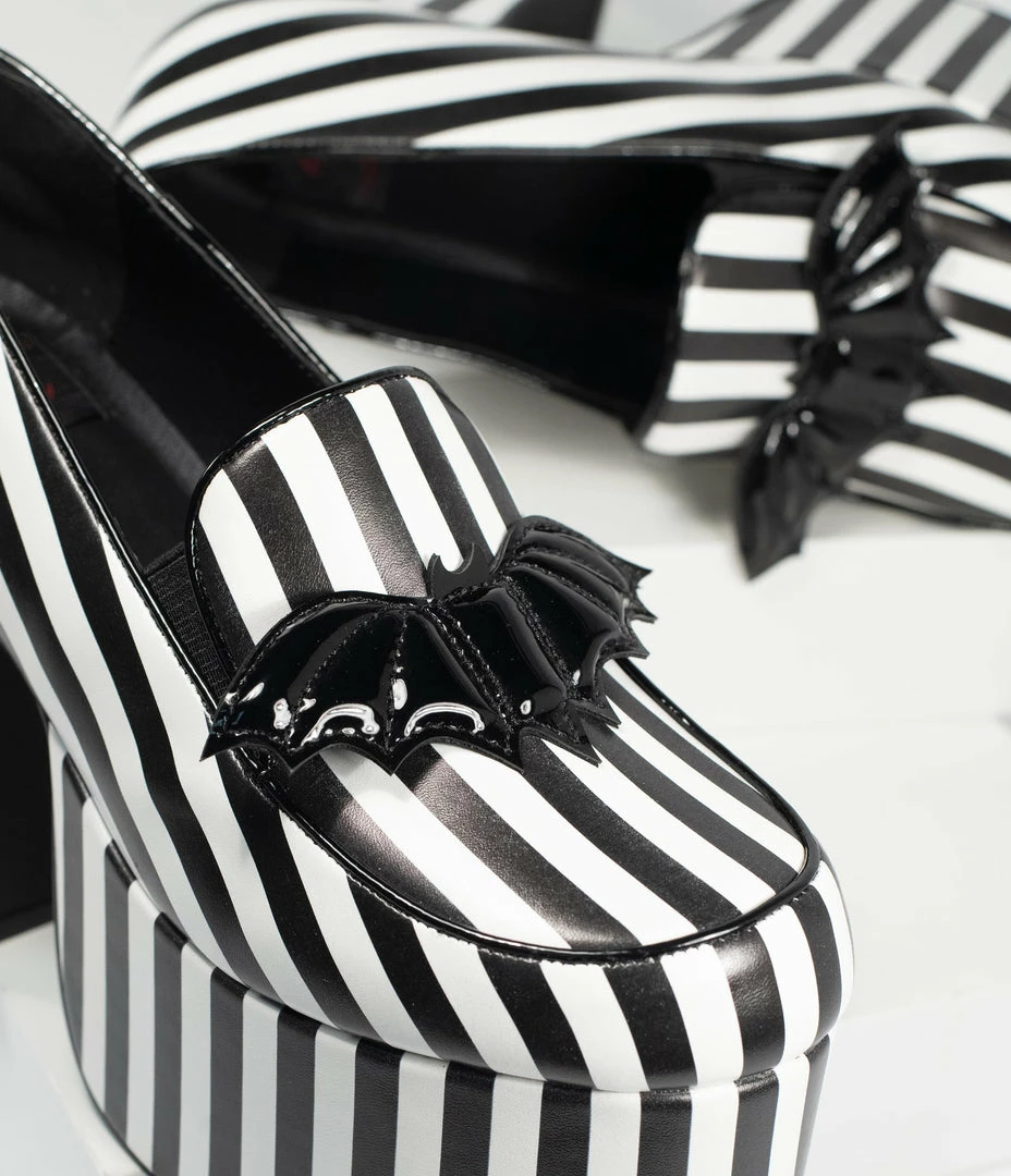 You’re in a wild mood tonight, darling! These stunning platforms are crafted in a hypnotizing black and white stripe leatherette and boast a stunning 4.5 inch heel and 2.5 inch platform. The adorable loafer vamp dances with a black patent leatherette bat for oodles of spooky delight!